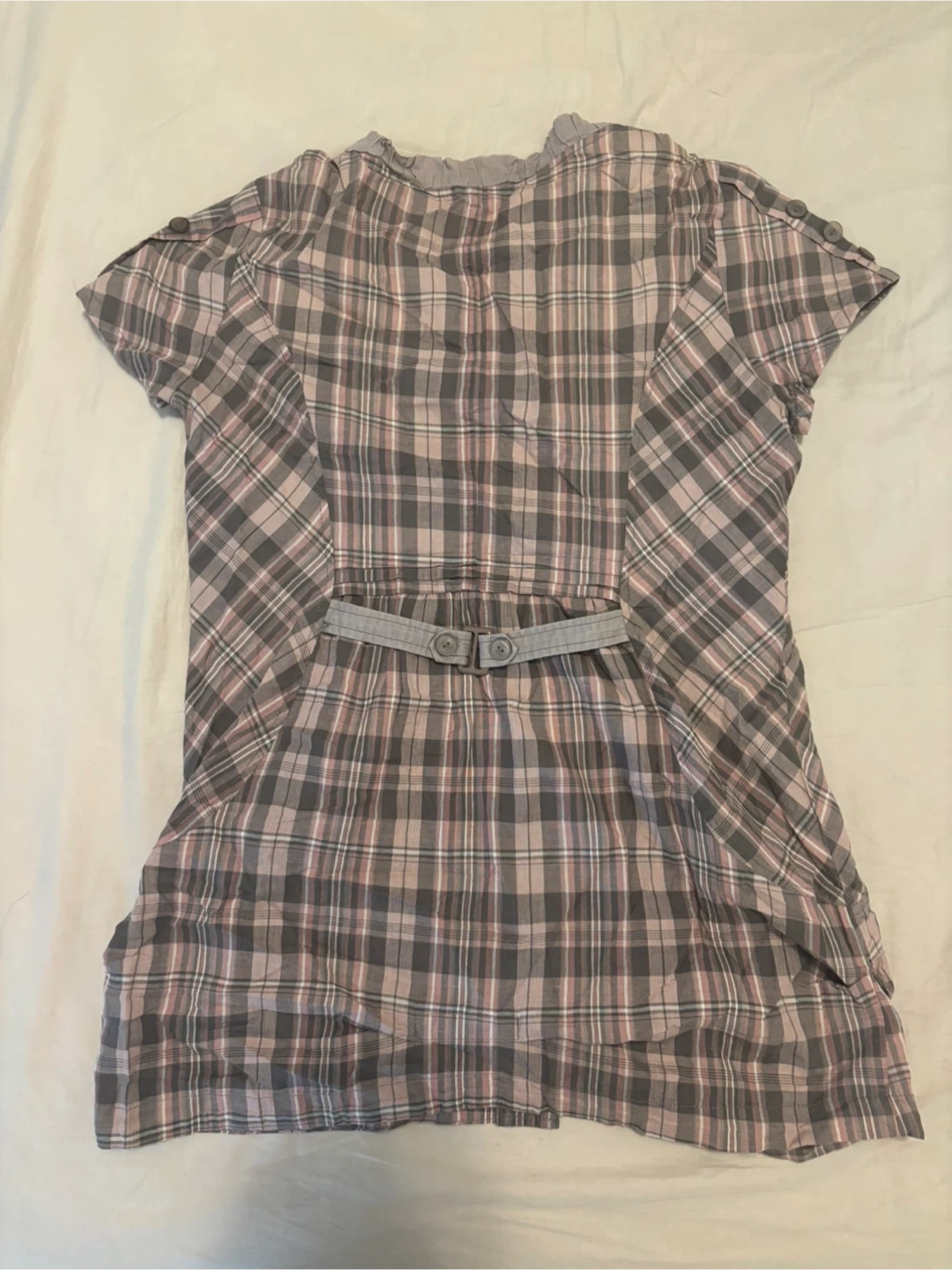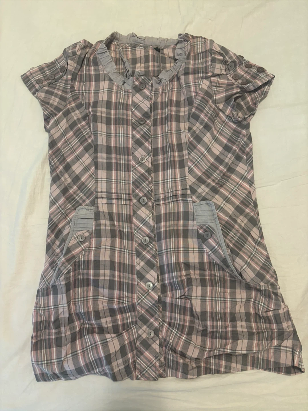 Cute tartan plaid dress in shades of grey, pink, and white. It has a button-up front and short sleeves. Perfect for a casual day out!