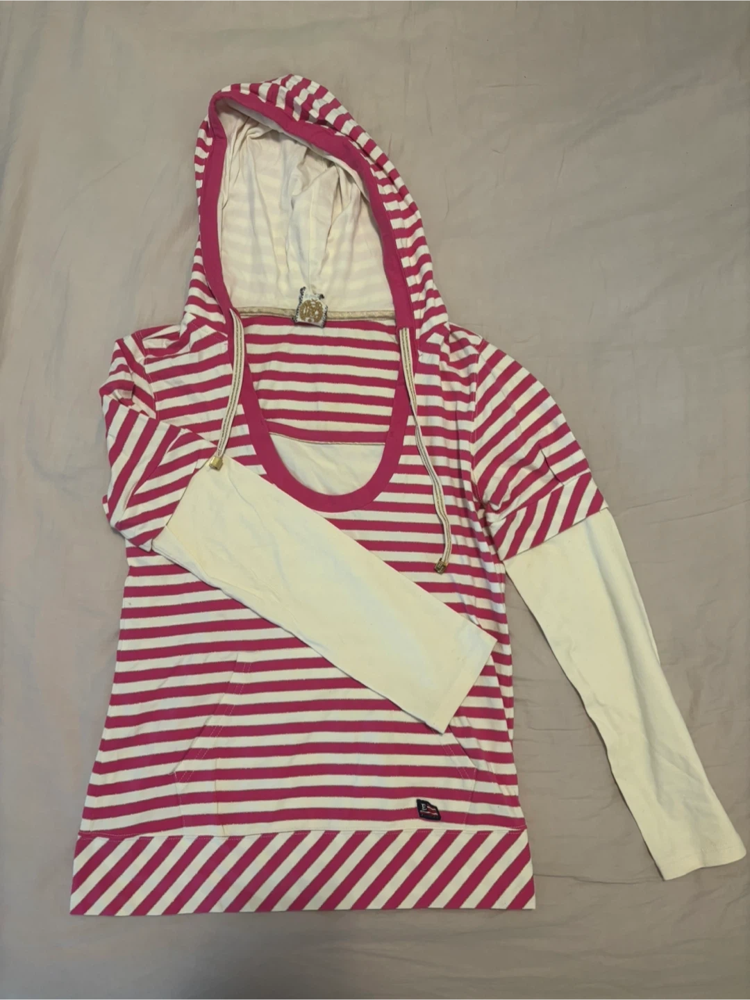 Bench hoodie with a striped pattern! It features a hood and long sleeves, perfect for layering or wearing on its own. It's in great condition and ready for a new home