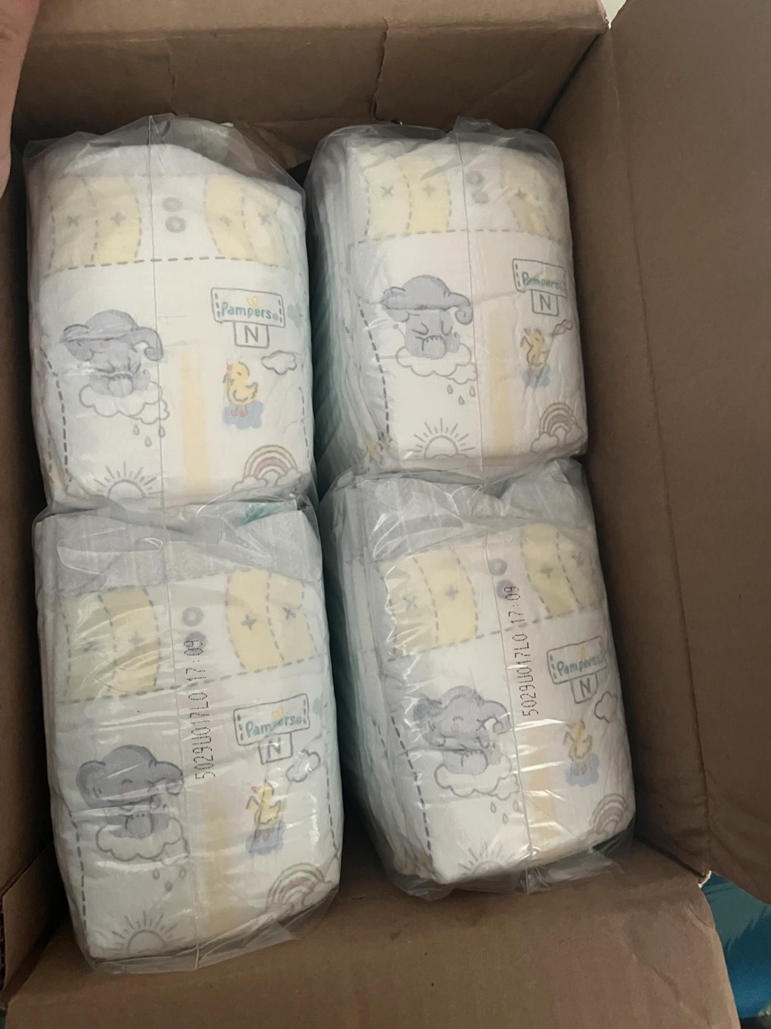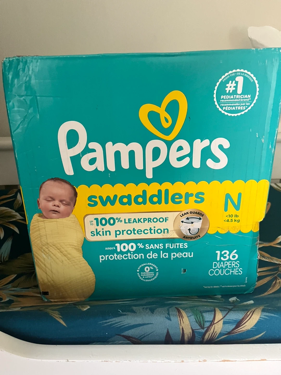 I'm selling a box of Pampers Swaddlers diapers, size N (Newborn, up to 10 lb or 4.5 kg). The box contains 136 diapers. They are 100% leakproof and provide skin protection. Price is firm first come first serve