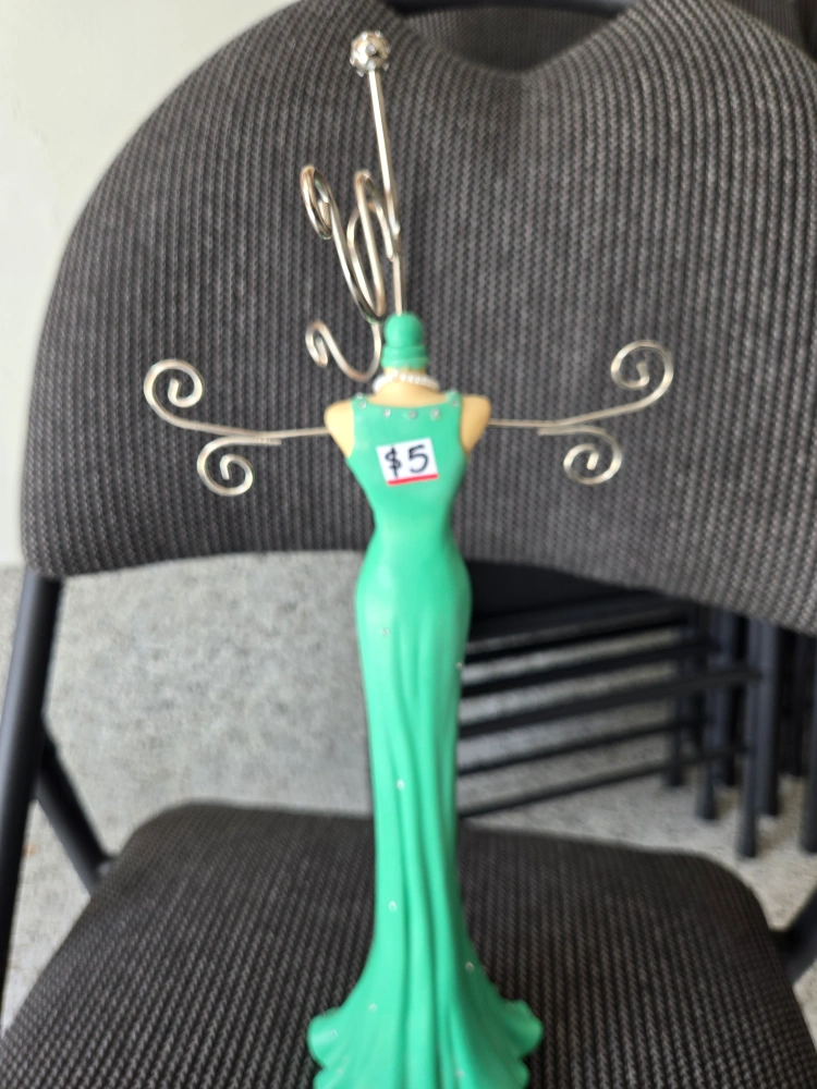 A cute little jewelry holder shaped like a green dress! It's perfect for hanging necklaces and bracelets. There's a small price tag on it for $5.Make me a resonable offer. Pick up location at Eglinton and Hurontario area.