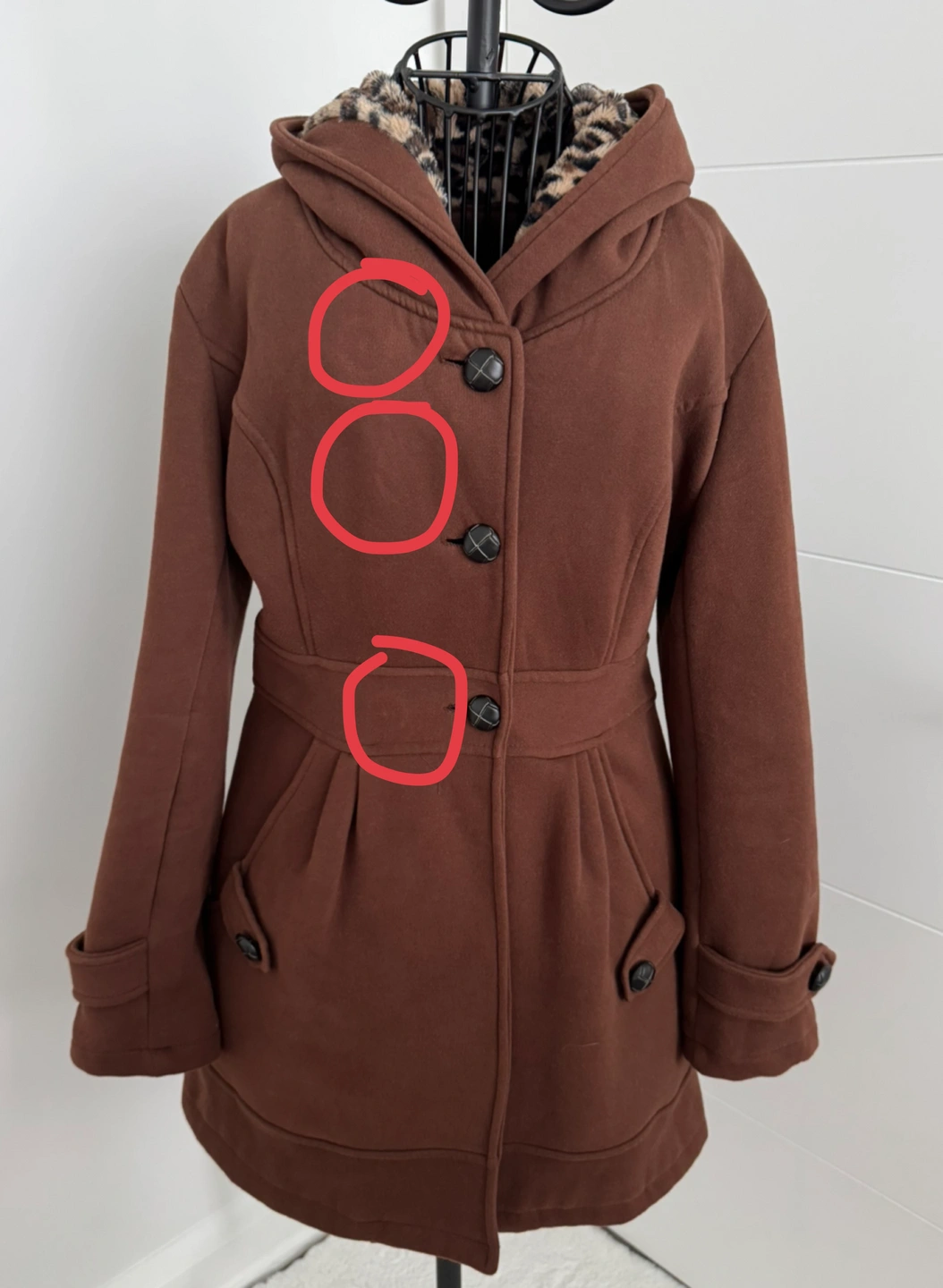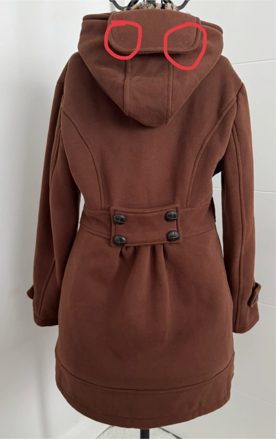 Discoloration from storage, likely imprinted from button (circled in picture)