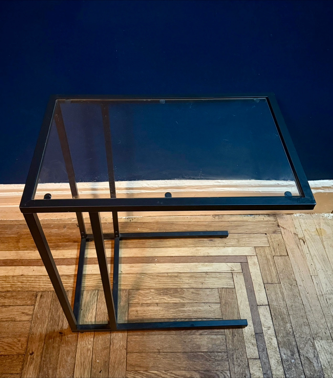 Black metal frame side table with a glass top. U shape design allows it to slide under couches or beds to maximize space. It's perfect for small spaces and adds a modern touch to any room