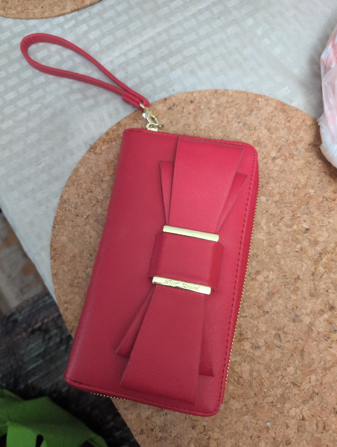 Selling a Betsey Johnson wallet in red! It features a bow design and a convenient wrist strap. Inside, there are card slots and a zippered compartment to keep your essentials organized