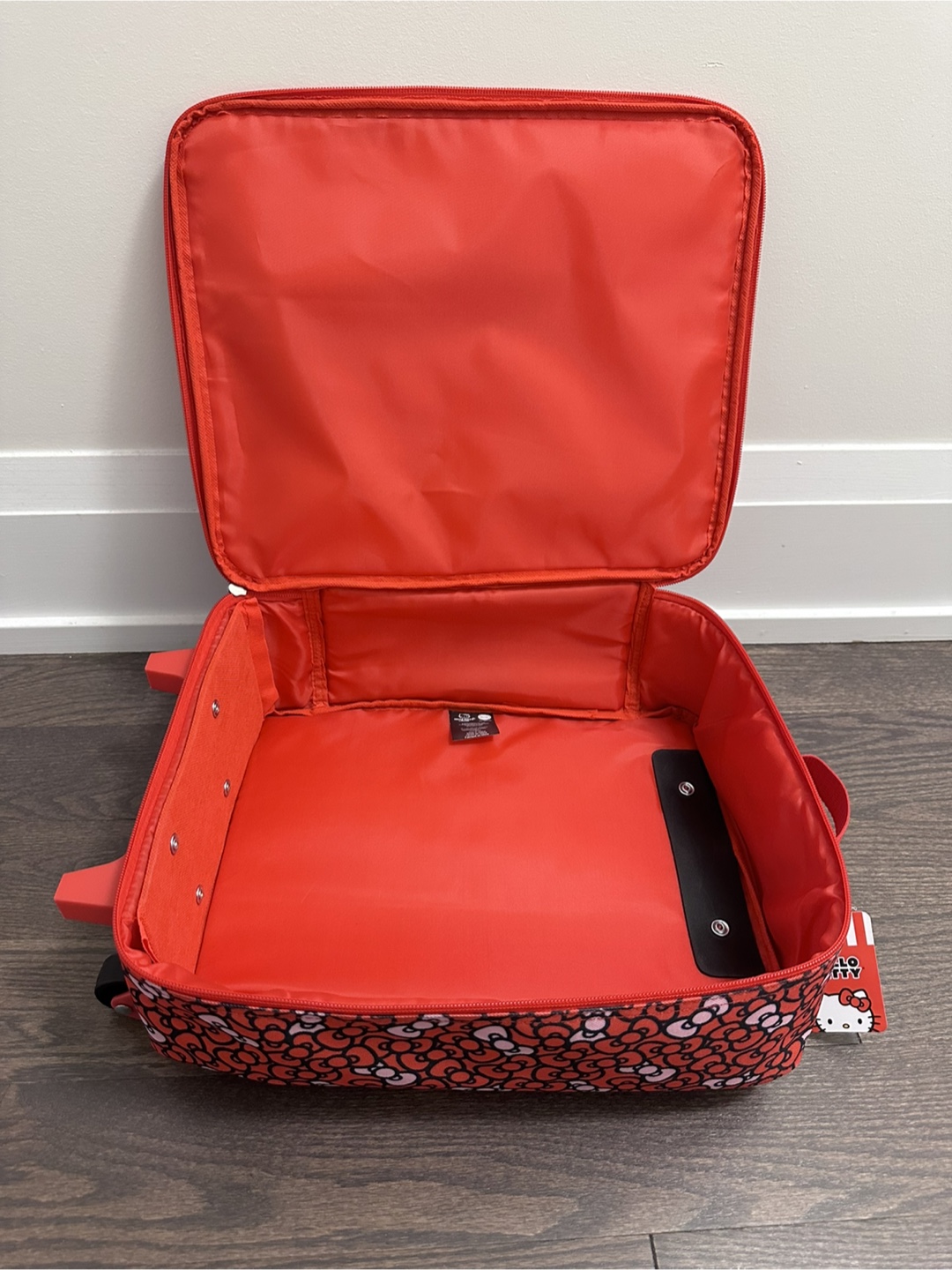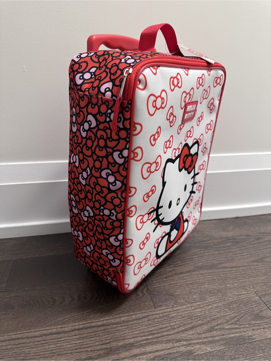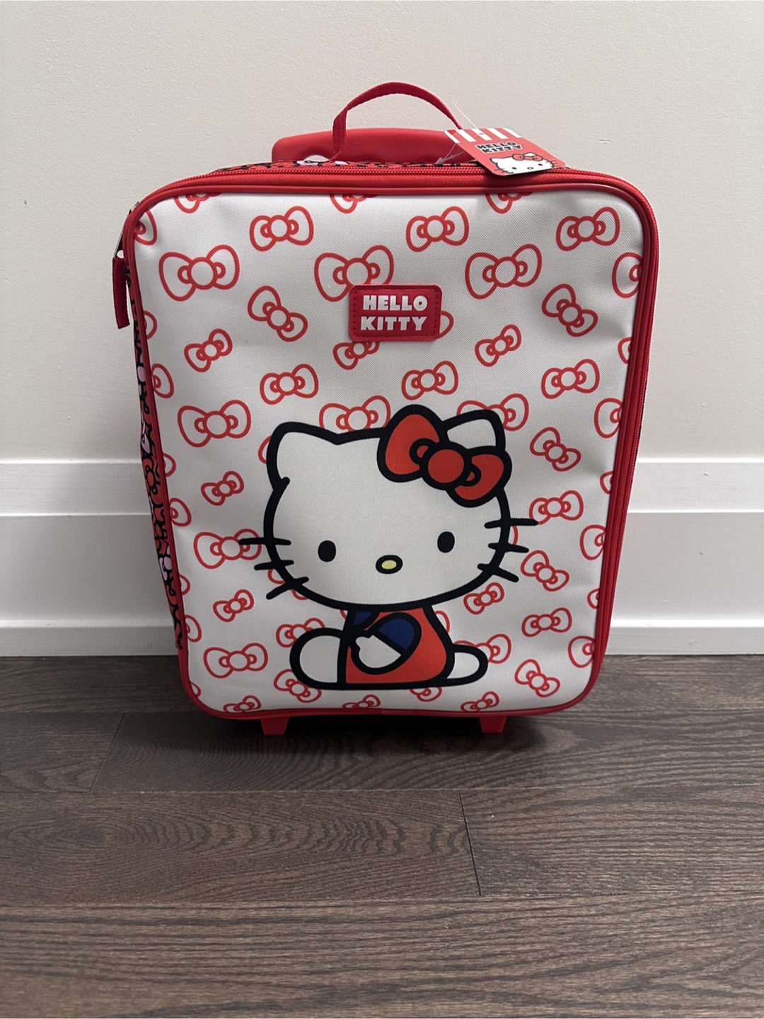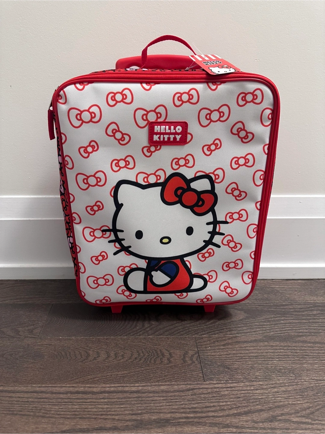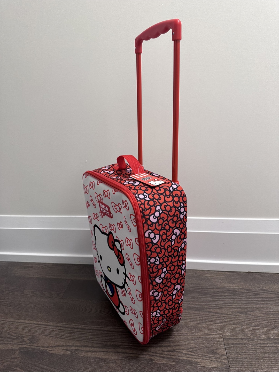 This Hello Kitty kids luggage is perfect for your little one's next trip! It features a fun Hello Kitty design in red and white. It's in brand new condition and ready for a new adventure. It has expandable handle, 2 wheels and zipper closure. Size: 14.5” height without handle and wheels (17” with handle and wheels) x 12” width x 6” depth.