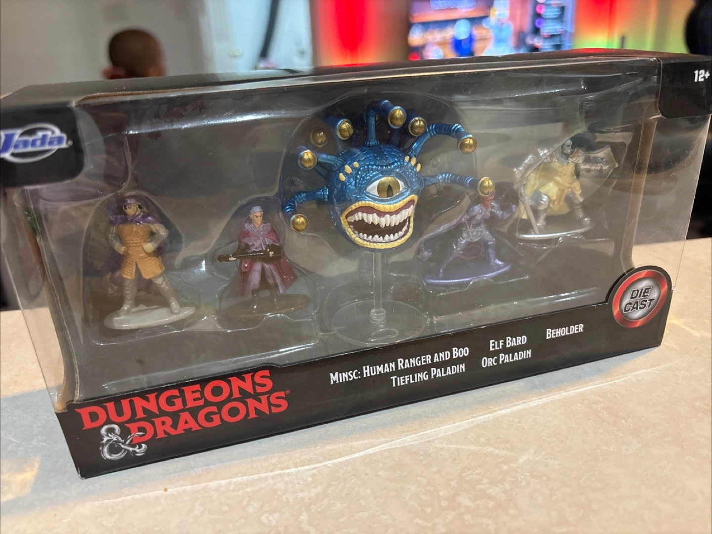 Selling a Dungeons & Dragons die-cast figures set by Jada. The set includes Minsc (Human Ranger and Boo), a Tiefling Paladin, an Elf Bard, an Orc Paladin, and a Beholder. Great for D&D fans and collectors!
