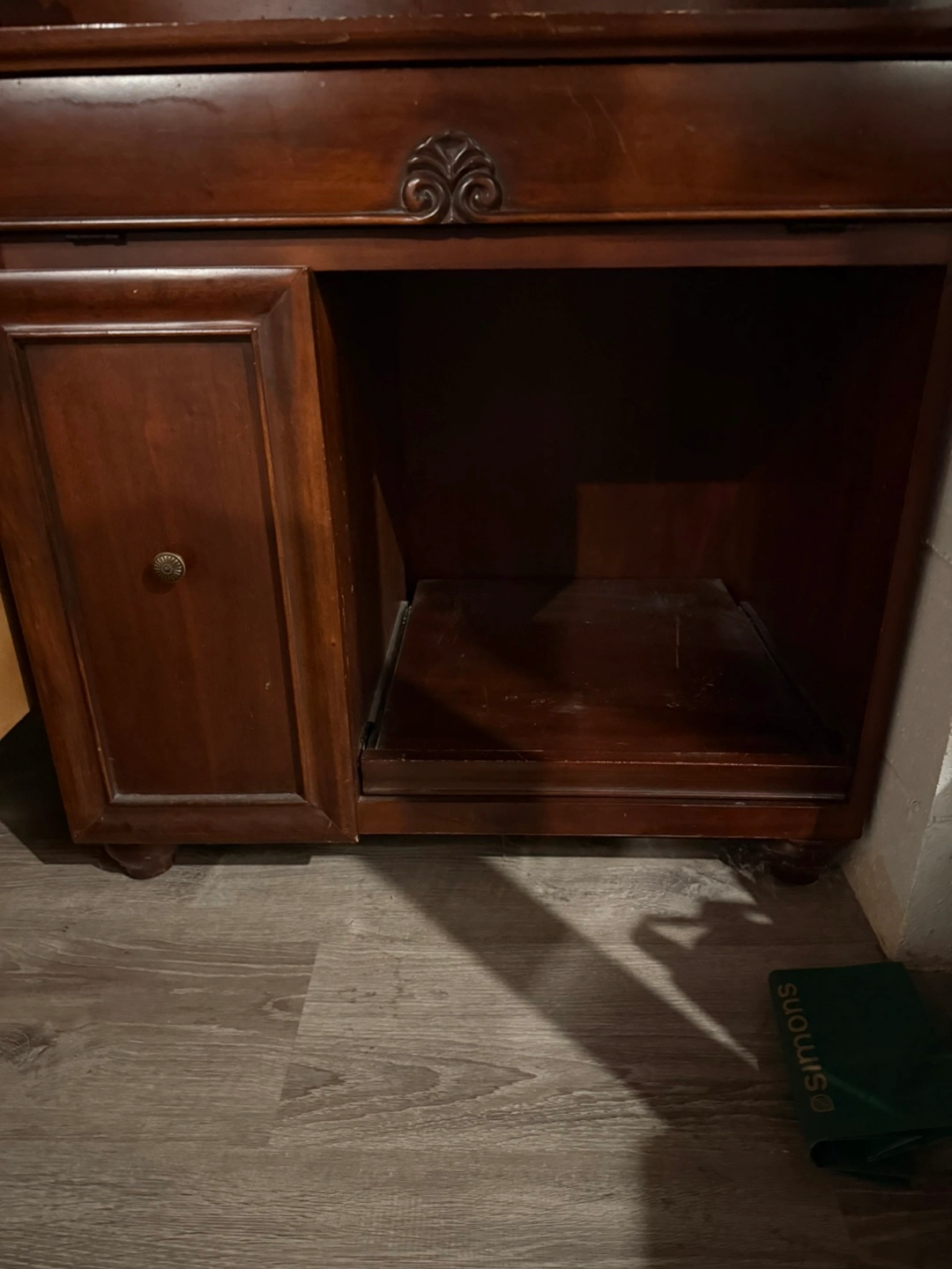 Selling a wooden cabinet. It's a nice piece of furniture that could be used for storage or as a decorative item. It features a door and an open shelf. It has a classic look!