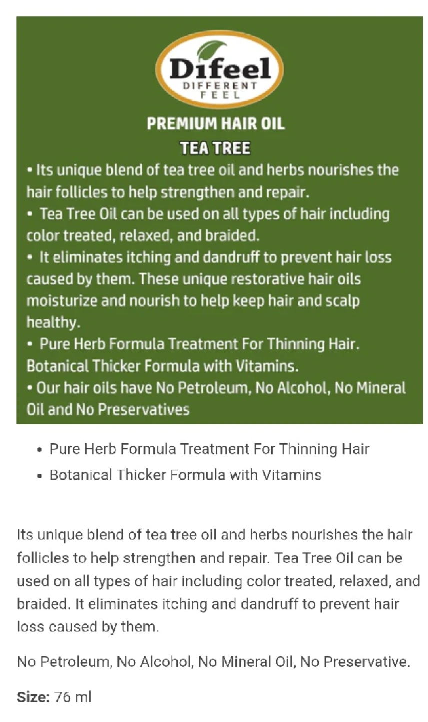 Selling a bottle of Difeel Tea Tree Premium Hair Oil! It's a 99% natural blend that helps soothe itchy, dry scalp while moisturizing and detoxifying hair. Contains 230ml/7.78 fl oz. retail Price for $9.99 + tax just once used