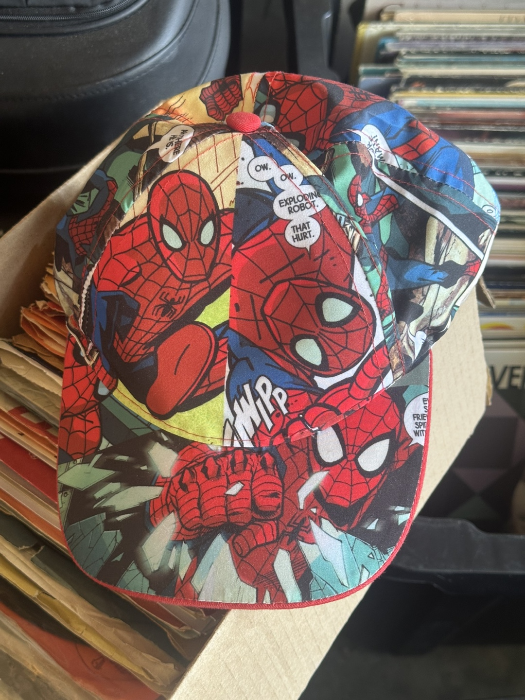 Selling a Marvel Spiderman comic themed hat! It's in great condition and features a vibrant comic book design. The hat is made of 100% polyester and is one size fits most (OSFM). Perfect for any Spiderman fan!