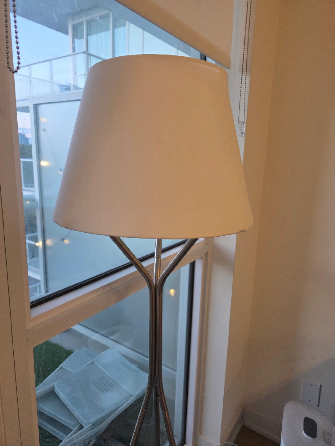 Selling a modern floor lamp with a white shade and a sleek silver base. It's in great condition and would look lovely in any living room or bedroom. The lamp provides a soft, ambient light, perfect for creating a cozy atmosphere in your home