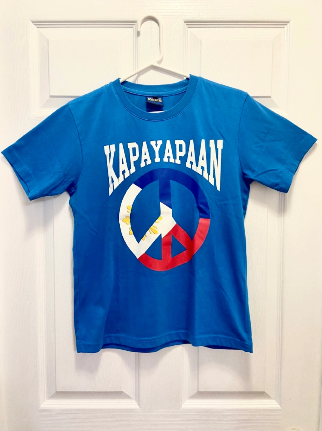 Small blue t-shirt featuring a Kapayapaan design with a peace symbol incorporating the colors of the Filipino flag. * Colour: Blue * Design: Kapayapaan with Filipino flag peace symbol * Size: Small (Please refer to the size tag in the images) It's quite fetching, don't you think? Don't delay, buy today! If the ad is up, it's available! Local pickup only.
