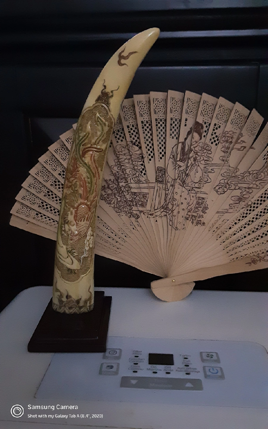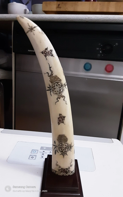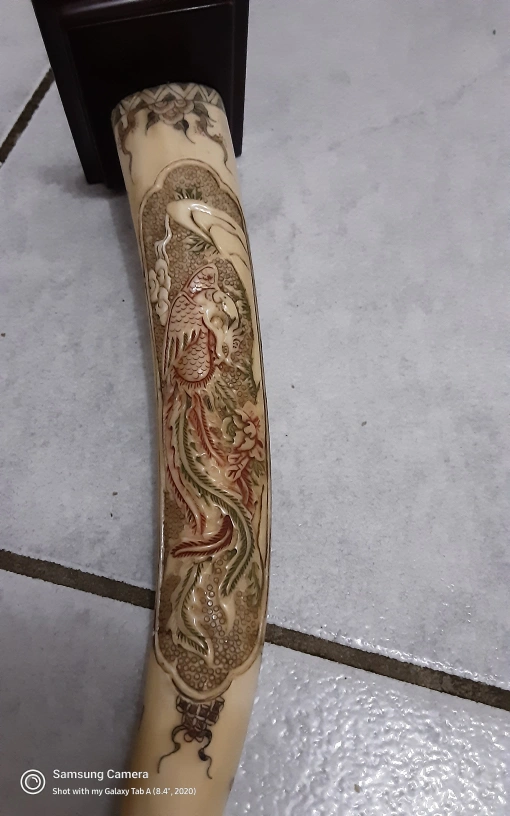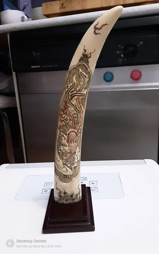 Here's a unique antique hand carved dragon, bone figurine. It features intricate designs and comes with a stand. It would make a great decorative piece for your home.