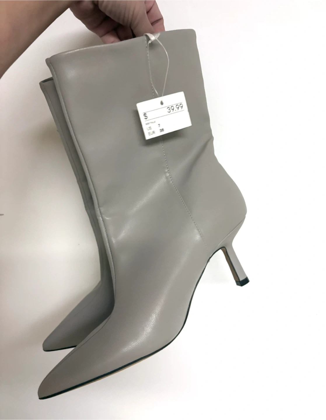 Selling a pair of mid calf heeled boots. They are a beautiful grey colour and made of faux leather. The size is US 7 / EUR 38. Paid 39.99 $ plus taxes These boots are in mint condition! Just tried on the size once but never worn as it’s big for me Price is firm Cash please