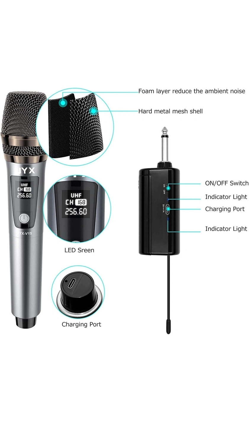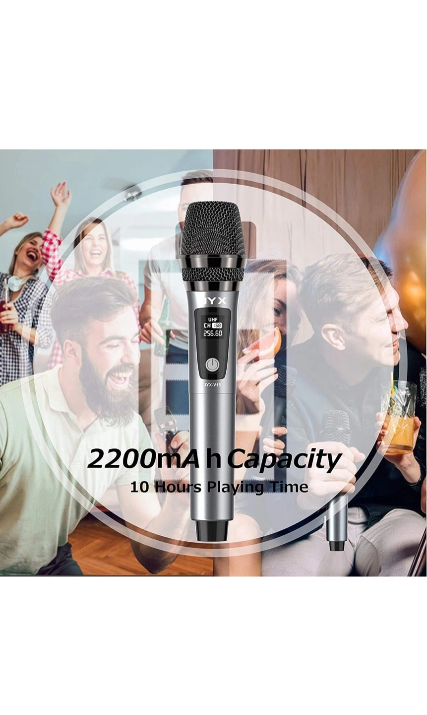 Selling a JYX-V15 microphone that's in excellent condition. It comes with all the original accessories and the box! This microphone has a 2200mAh capacity, providing up to 10 hours of playing time. Perfect for karaoke or any event!