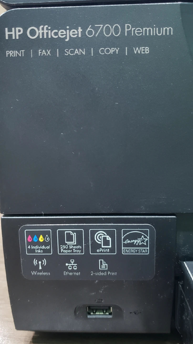 Selling an HP Officejet 6700 Premium printer. It can print, fax, scan, and copy. It uses 4 individual ink cartridges and has a 250-sheet paper tray. It also features ePrint, is Energy Star certified, and has wireless and Ethernet connectivity. It also supports 2-sided printing