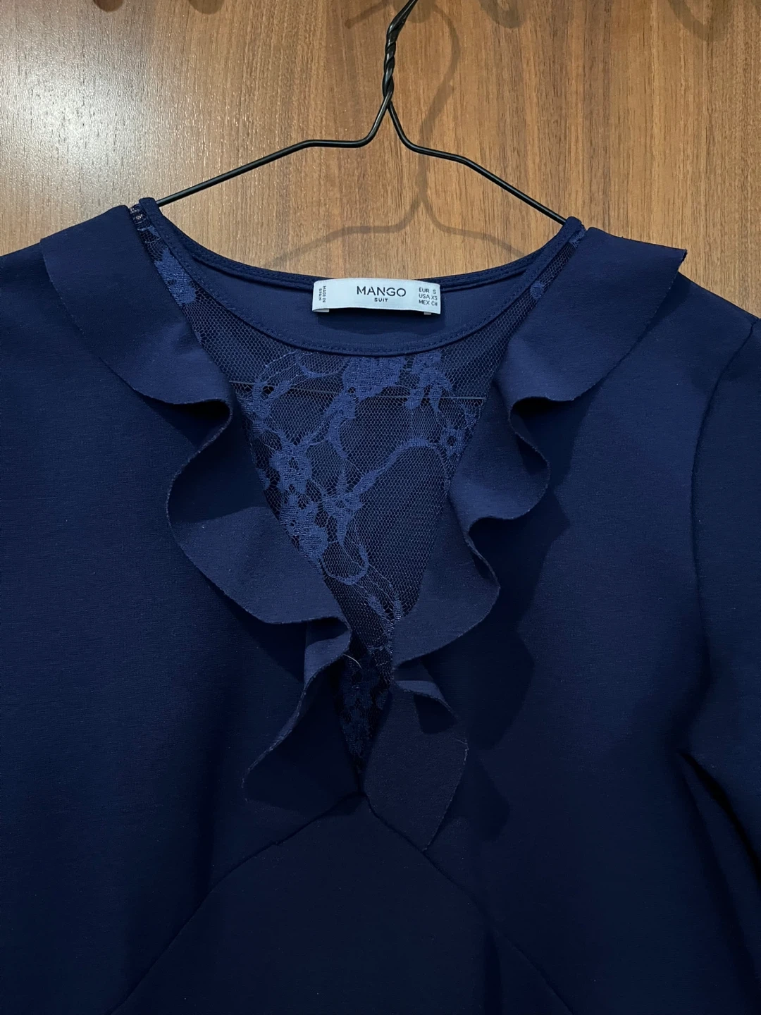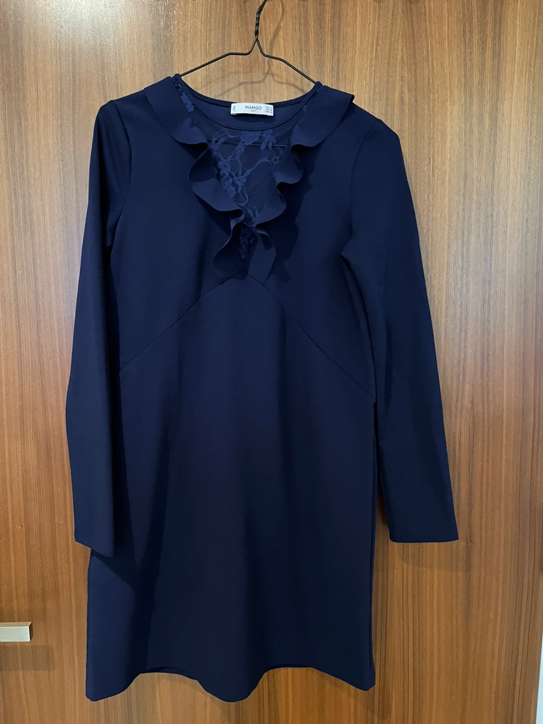 A beautiful Mango Suit dress in a deep navy colour! It features a lovely lace detail at the neckline and a flattering fit. Size S.