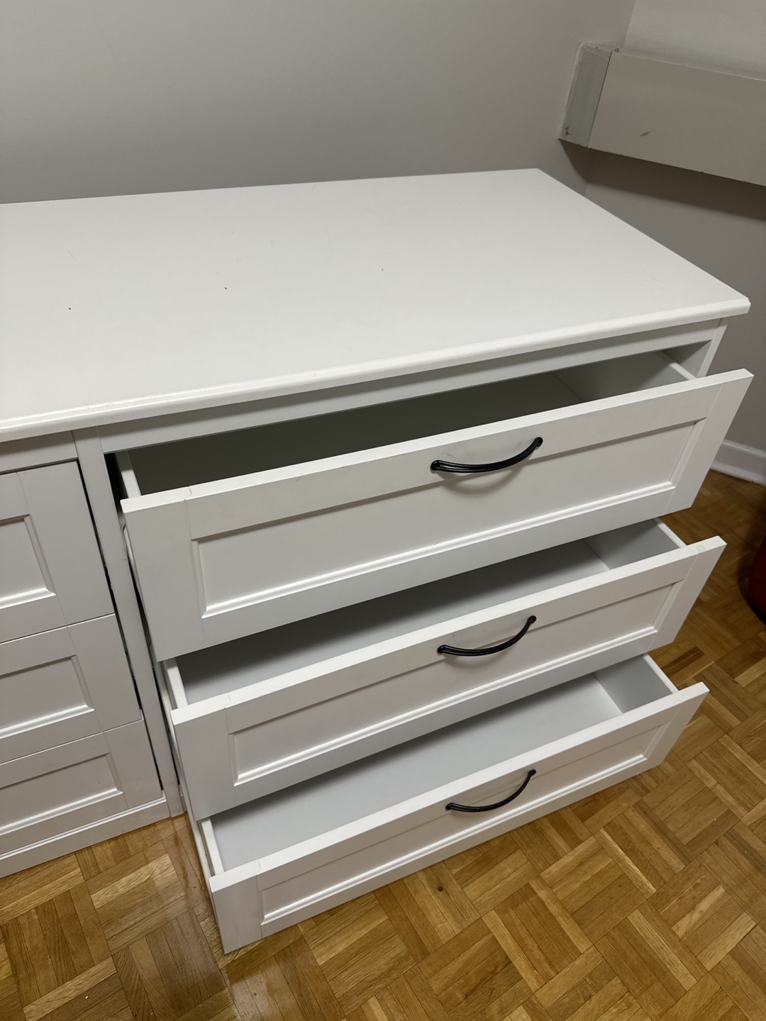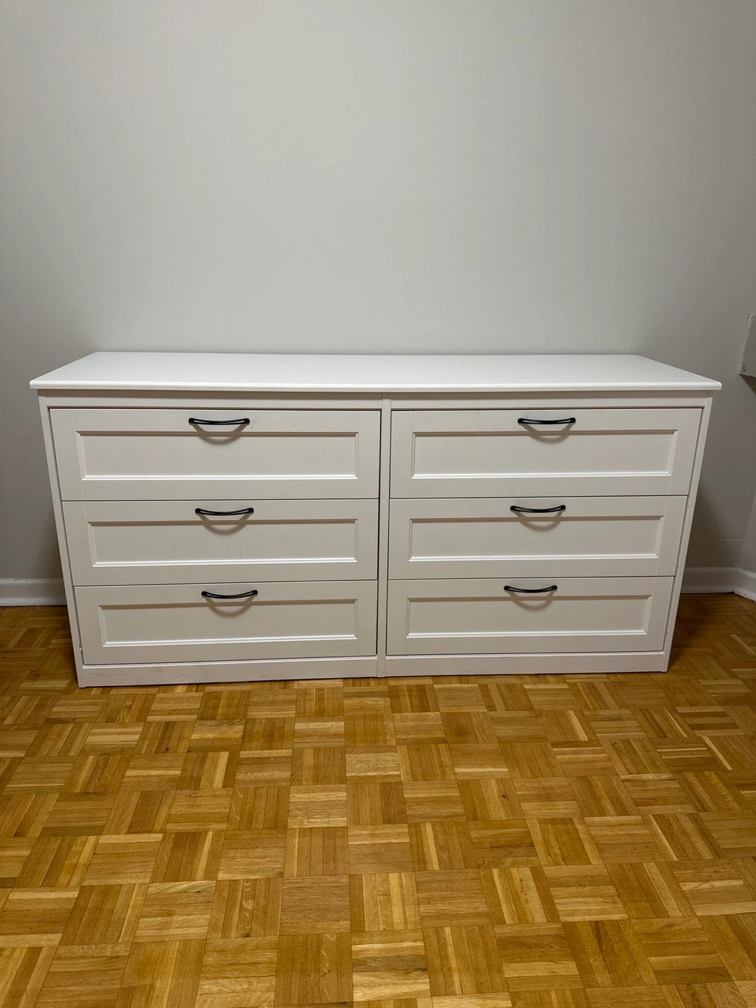 Selling a white IKEA Hemnes 6-drawer dresser. It's in good condition and has lots of storage space. There are some minor signs of wear, as shown in the photos.