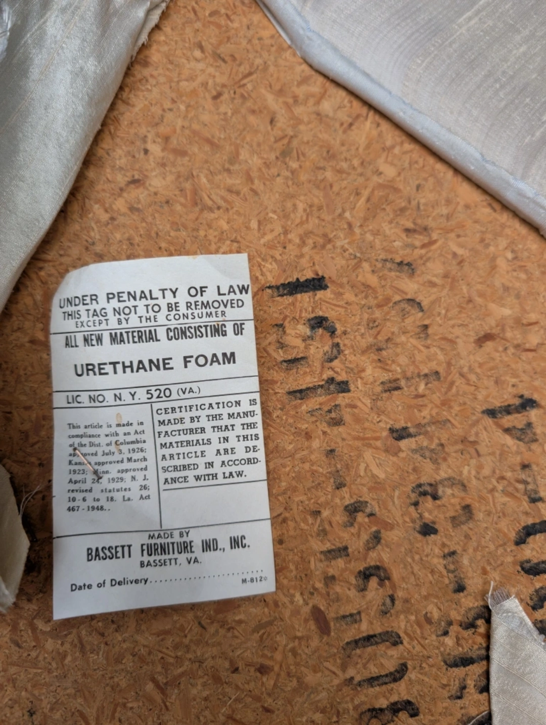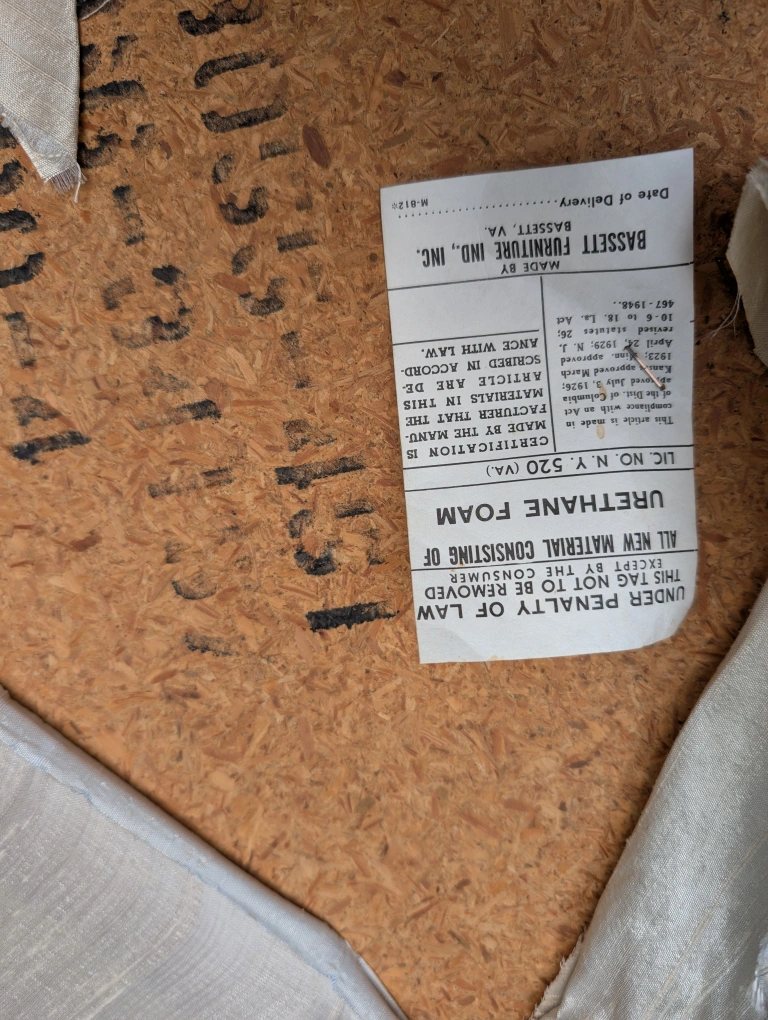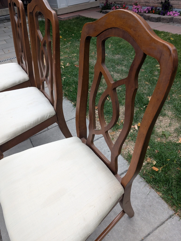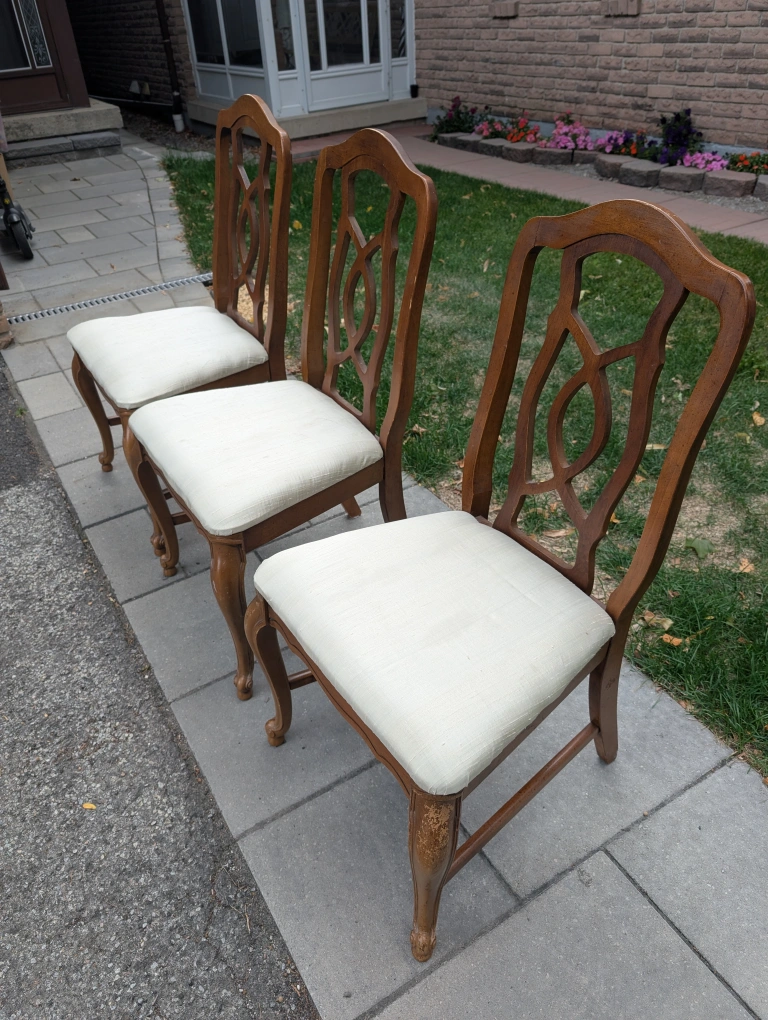 1000+Selling a set of three dining chairs from Bassett Furniture. They have a classic design with a wooden frame and upholstered seats. Perfect for adding a touch of elegance to your dining area! There is a little tear on the side of one of the chairs - can probably be fixed, no impact on function