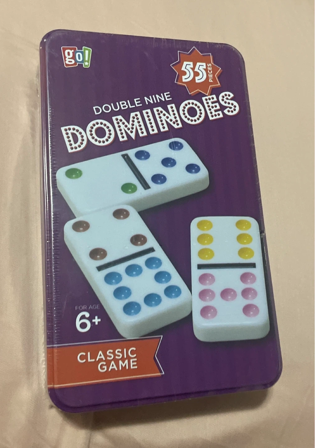 Selling a brand new, still sealed Double Nine Dominoes set by GO! Games! It's a classic game for ages 6+. Includes 55 double nine color dot dominoes, a starter piece, and instructions. Originally bought for $16.99