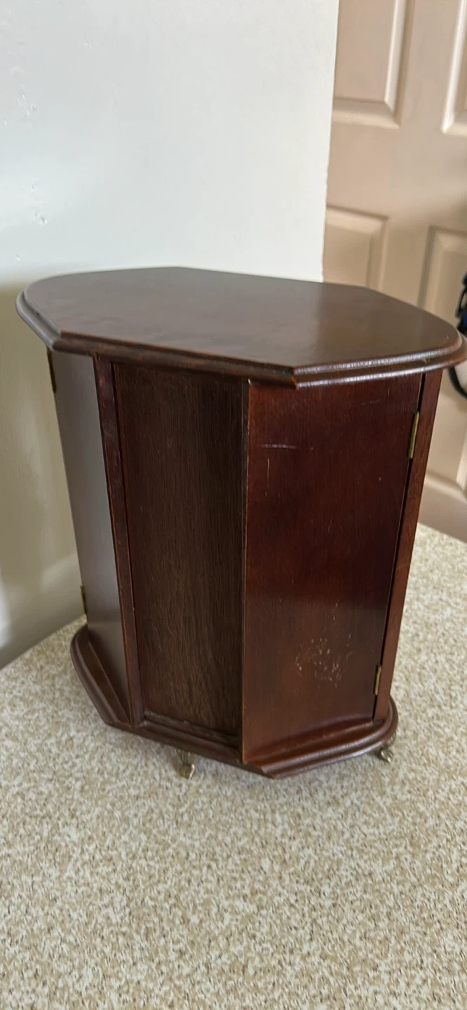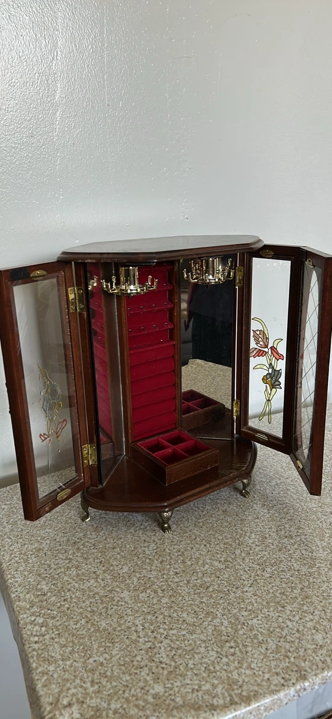 Selling a lovely wooden jewelry box! It features a mirror and a red velvet interior to keep your precious items safe and organized. The box has a unique design with floral accents on the glass doors. It's perfect for storing rings, necklaces, and earrings.