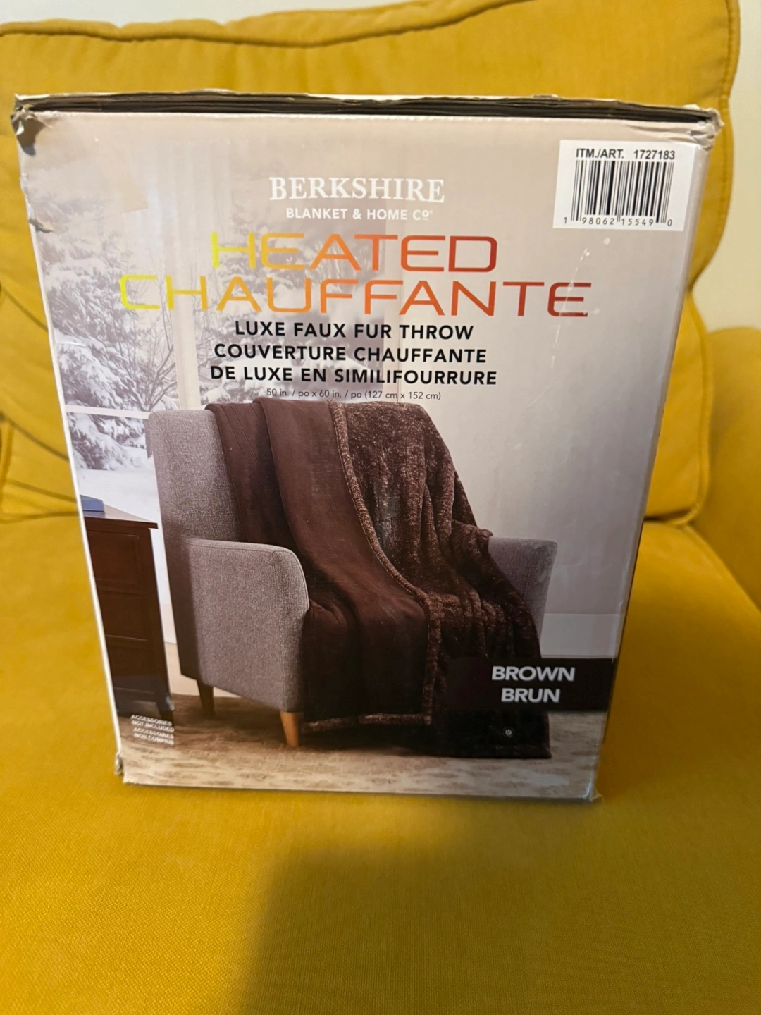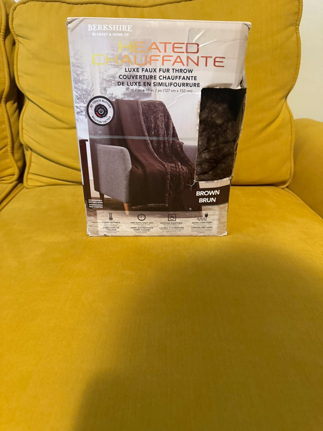 Wrap yourself in cozy warmth with this new Berkshire Blanket & Home Co. Luxe Faux Fur Heated Throw. This luxurious brown throw, measuring 50 in x 60 in (127 cm x 152 cm), offers the ultimate comfort and relaxation with its soft faux fur and soothing heat. It's perfect for chilly evenings and adds a touch of elegance to any room. Additional Specs: * Brand: Berkshire Blanket & Home Co. * Type: Heated Throw * Material: Faux Fur * Colour: Brown * Dimensions: 50 in x 60 in (127 cm x 152 cm) * Condition: New I'm asking $40 for this heated throw, which is a steal compared to retail prices. Don't miss out on the chance to add this luxurious and practical item to your home! If the ad is up, it’s available! Don't delay, cozy days await! Pick up in Lower Mount Royal . Please check out more of my items and get a good deal.