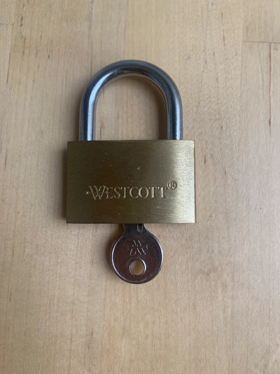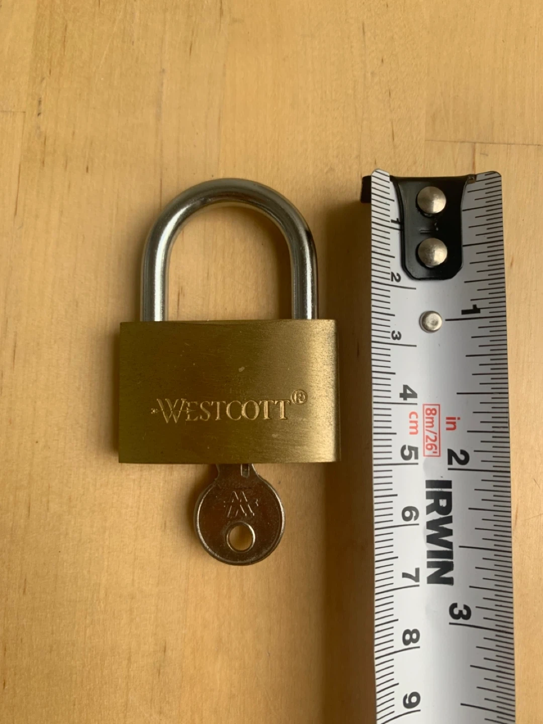 Selling a Westcott padlock, complete with its key. It measures approximately 1.5 inches wide, as shown in the photos. Perfect for securing your belongings!