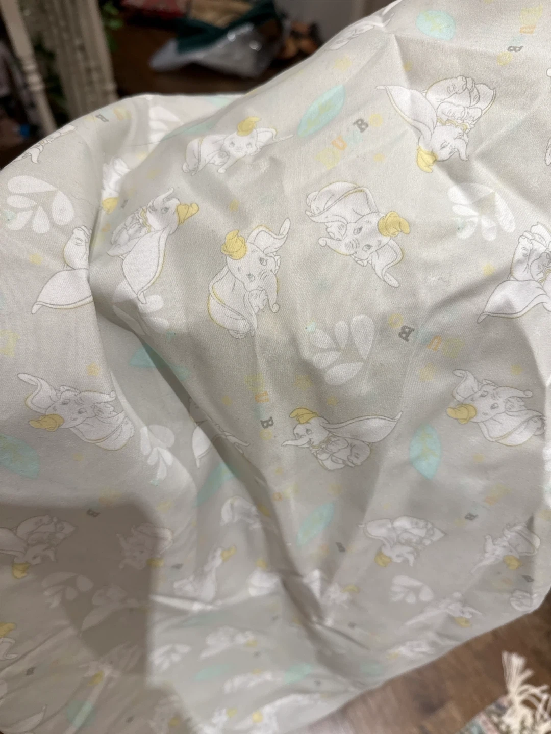 Fabric with a cute Dumbo print! Perfect for sewing projects or crafts. The material is soft and appears to be in good condition.