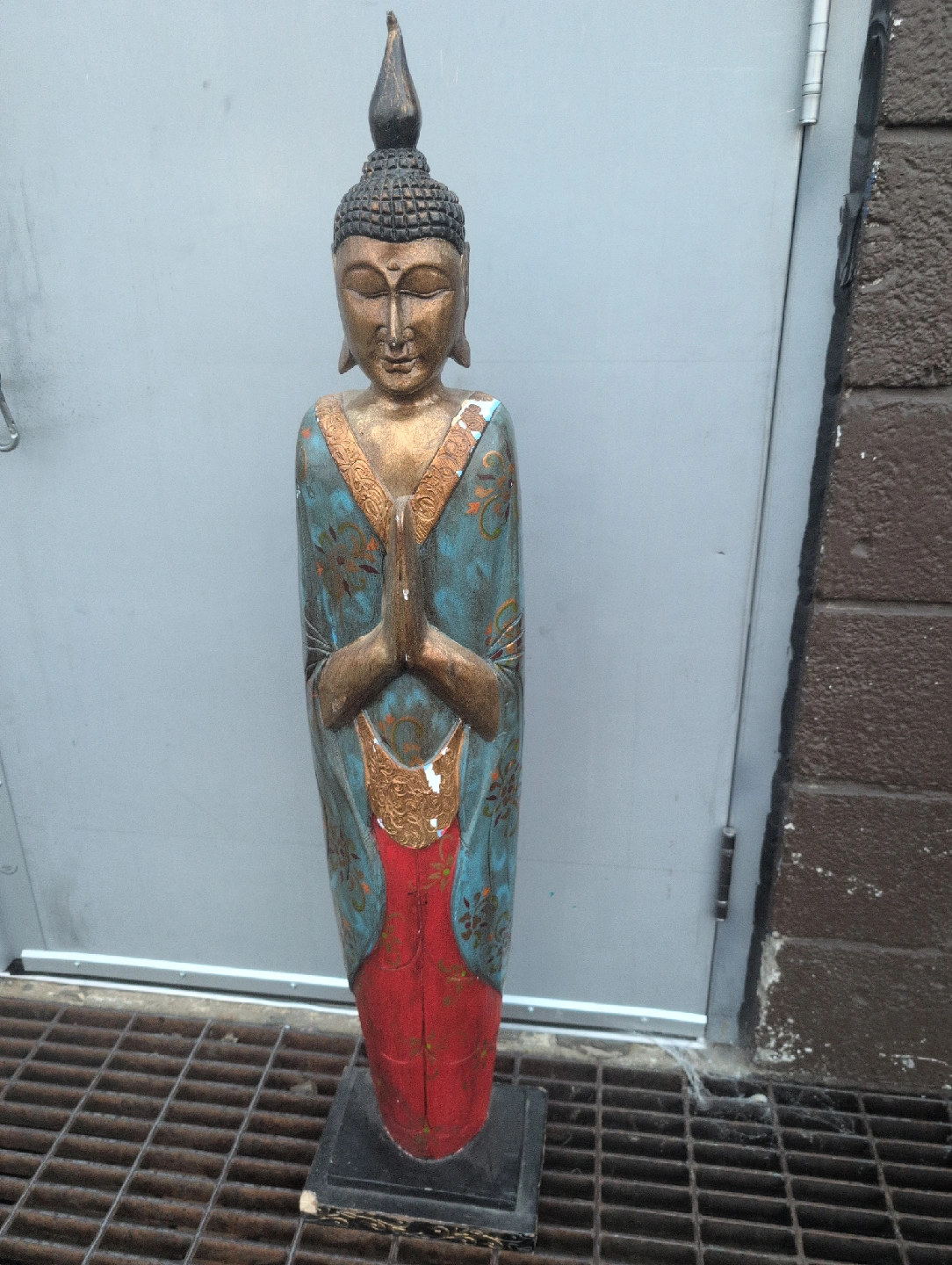 Here's a lovely wooden Buddha statue. It's a beautiful piece for adding a touch of tranquility to any space. The statue features a serene expression and is painted with calming colours. It would make a great addition to your home or garden
