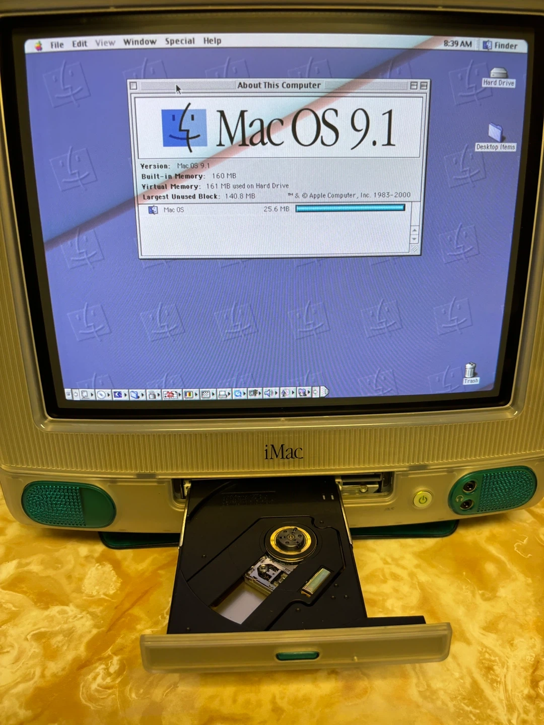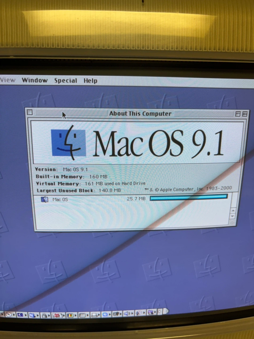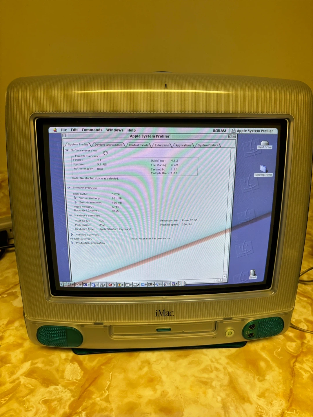 Selling a working iMac G3 Bondi Blue desktop computer PowerPC G3 processor running at 266 MHz with 160MB RAM and CD-ROM. It's running Mac OS 9.1 and includes a power cable.