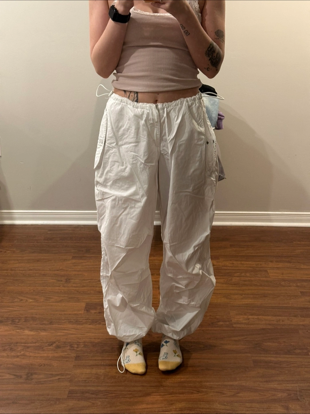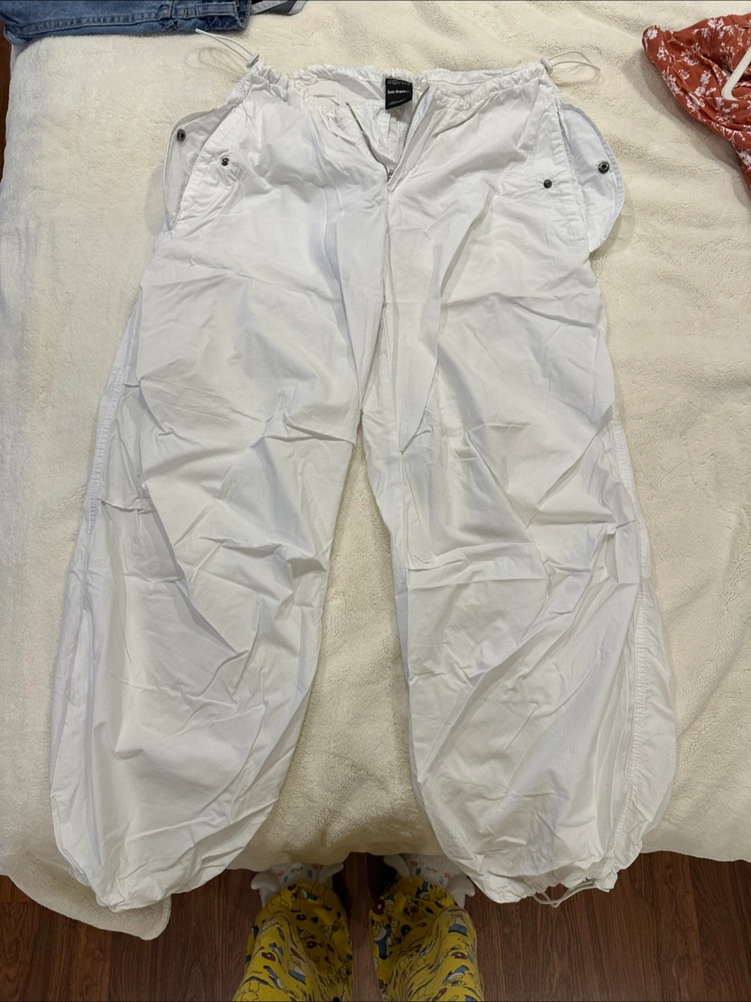 Selling a pair of white cargo pants.