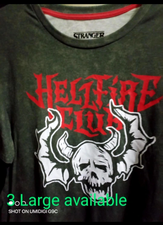 Selling a Stranger Things Helfire Club T-Shirt in size large! The shirt is in great condition and features the iconic Helfire Club design. Perfect for any Stranger Things fan! Gray color. New with tag.