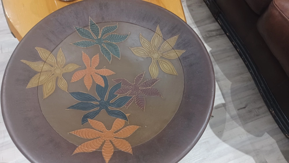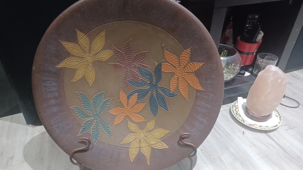 Selling a decorative plate that comes with its own stand! The plate has a lovely floral design with different coloured leaves. It's perfect for adding a touch of style to any room!