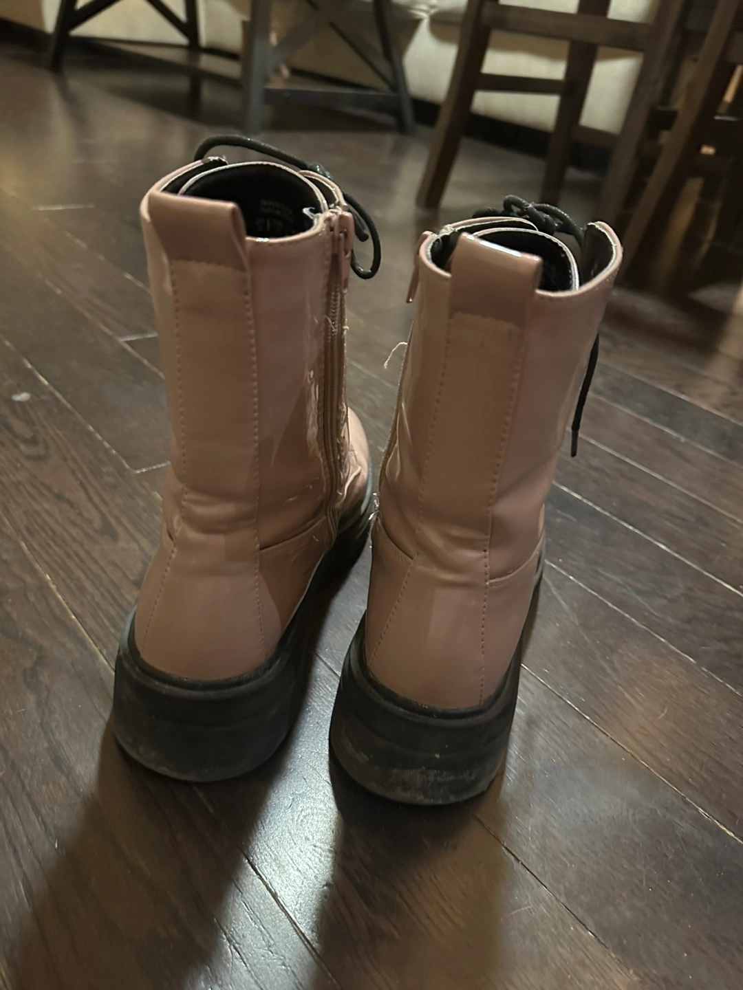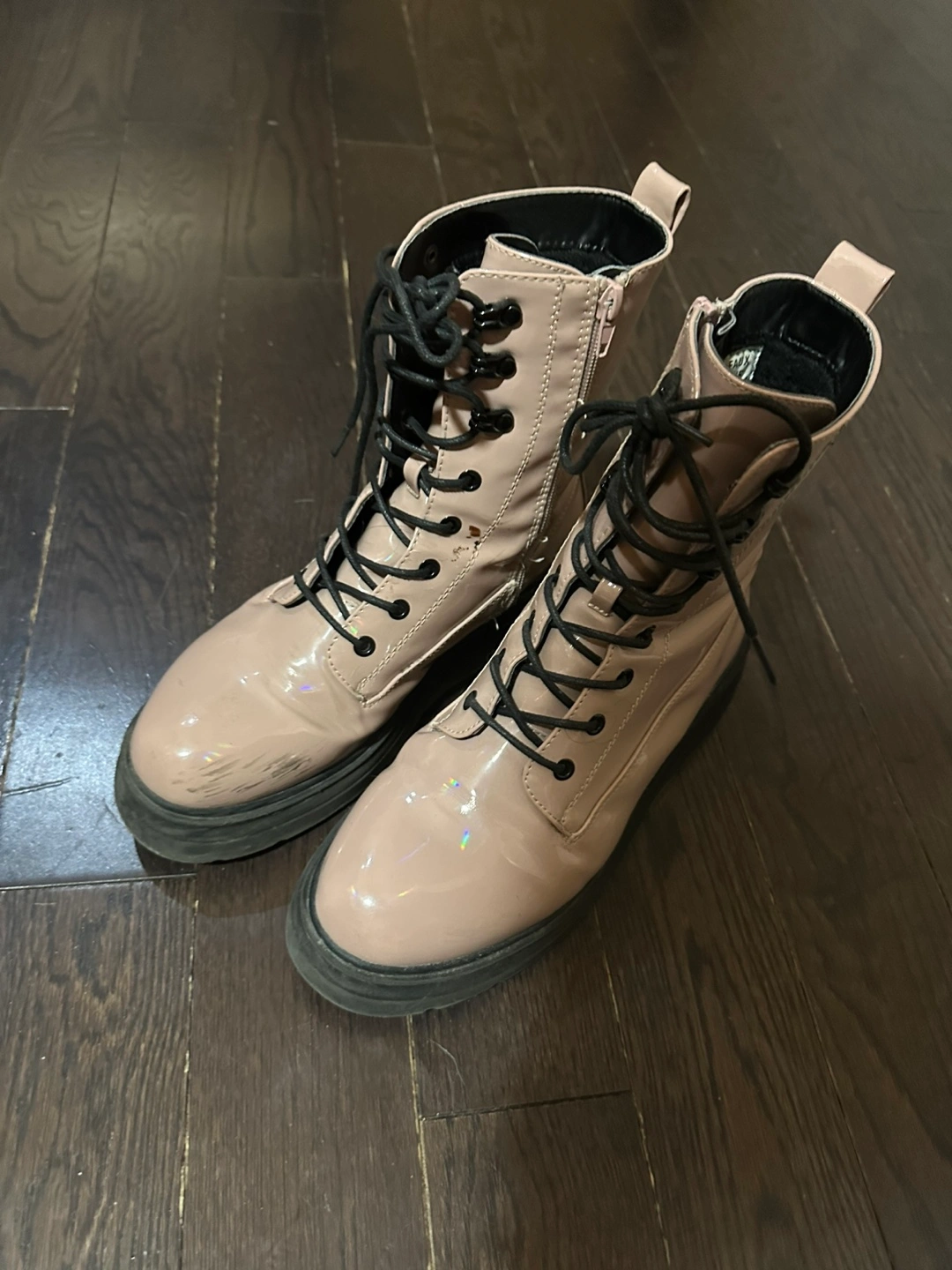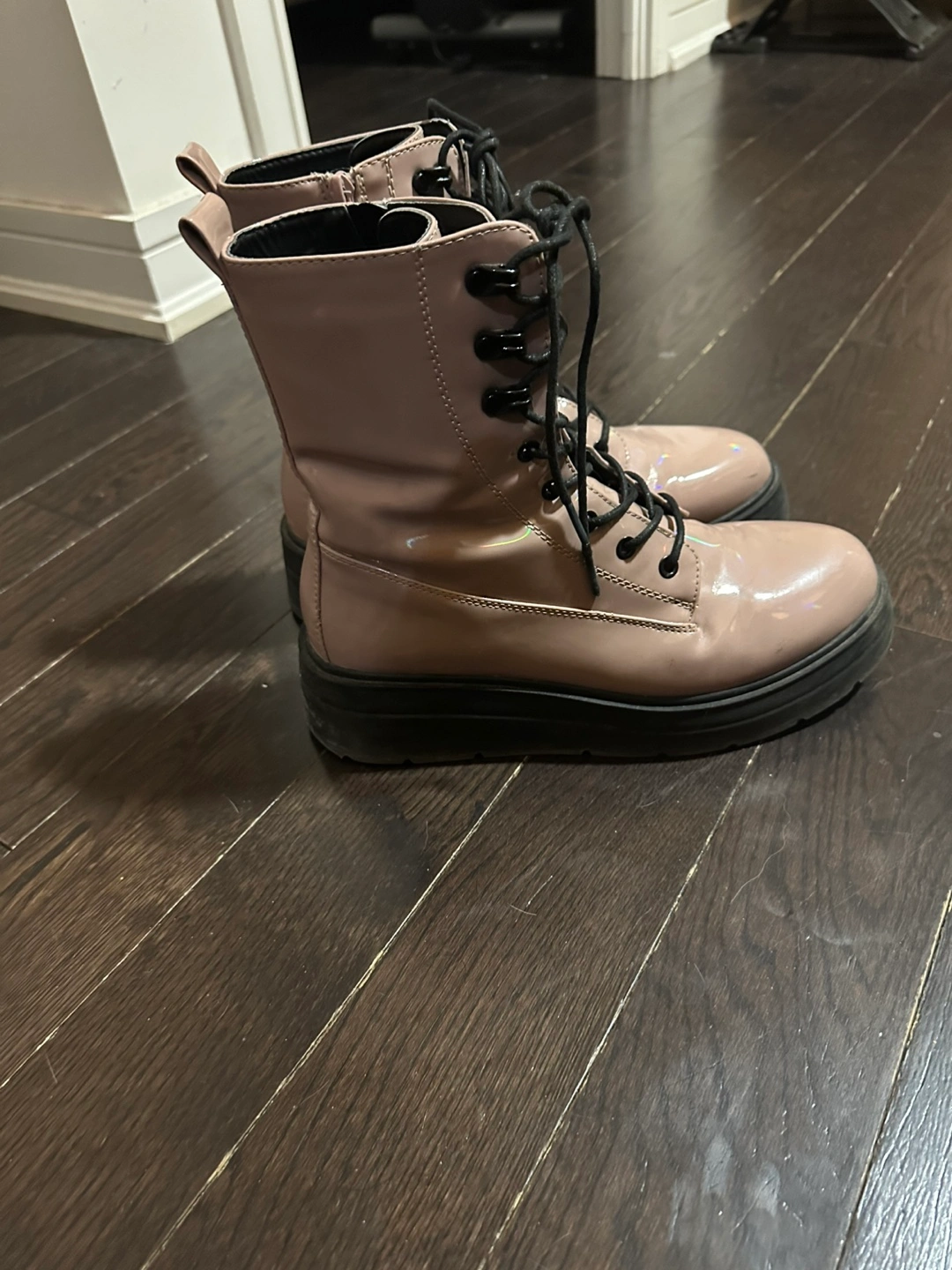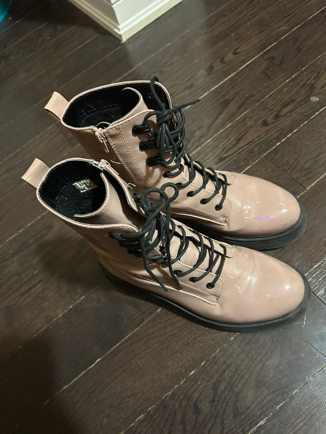 Selling a pair of pink patent combat boots! They have black laces and a zipper on the side. There are some scratches on the toe of one boot.