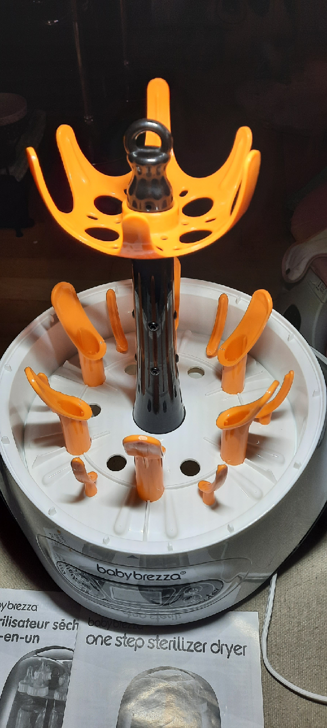 Selling a Baby Brezza One Step Sterilizer Dryer! It's white and has a large universal capacity. The product dimensions are approximately 15.5" in height, 12" in width, and 10" in depth. It's a great way to sterilize and dry baby bottles and accessories quickly and easily. Comes with instructions.