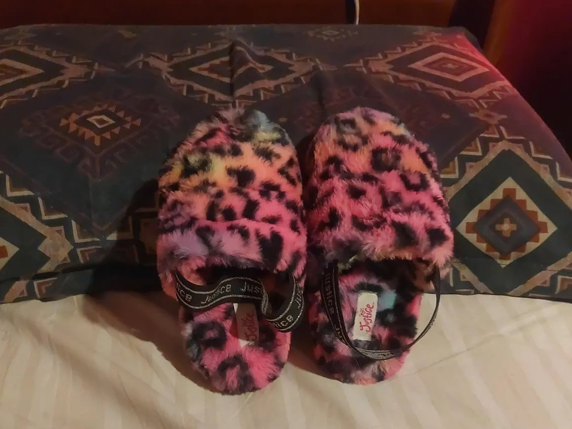 Super comfy Justice brand fuzzy slippers! They feature a fun leopard print design in pink, black, and yellow. Perfect for lounging around the house!