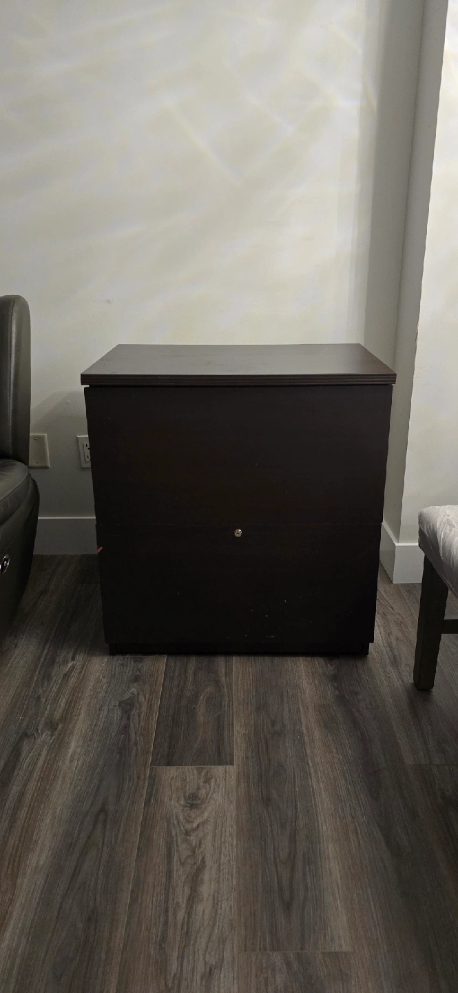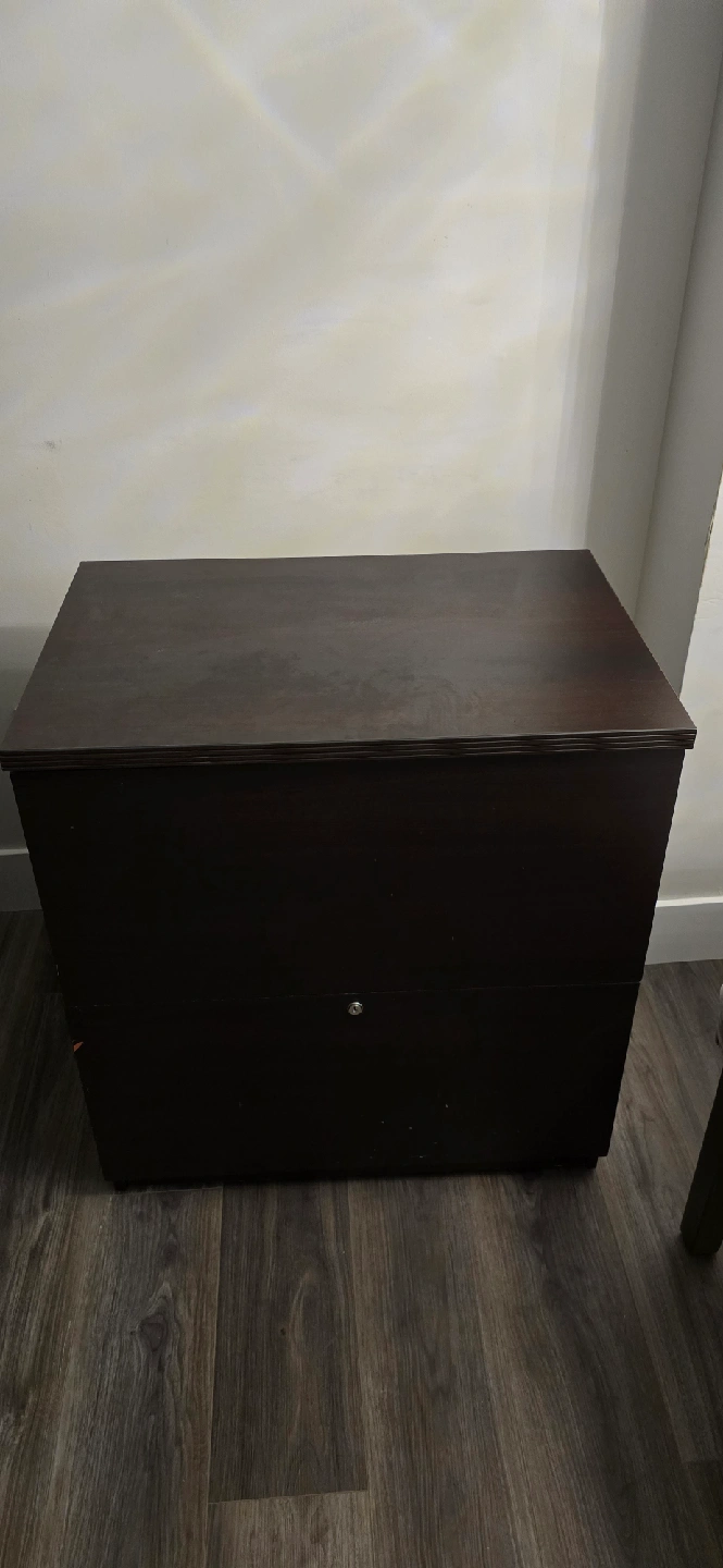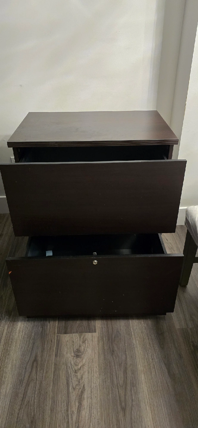 Selling a two-drawer filing cabinet in a dark brown colour. It's perfect for organizing your documents and keeping your workspace tidy. It has a sleek design that fits well in any home office or study. pick up Only Queensborough area!