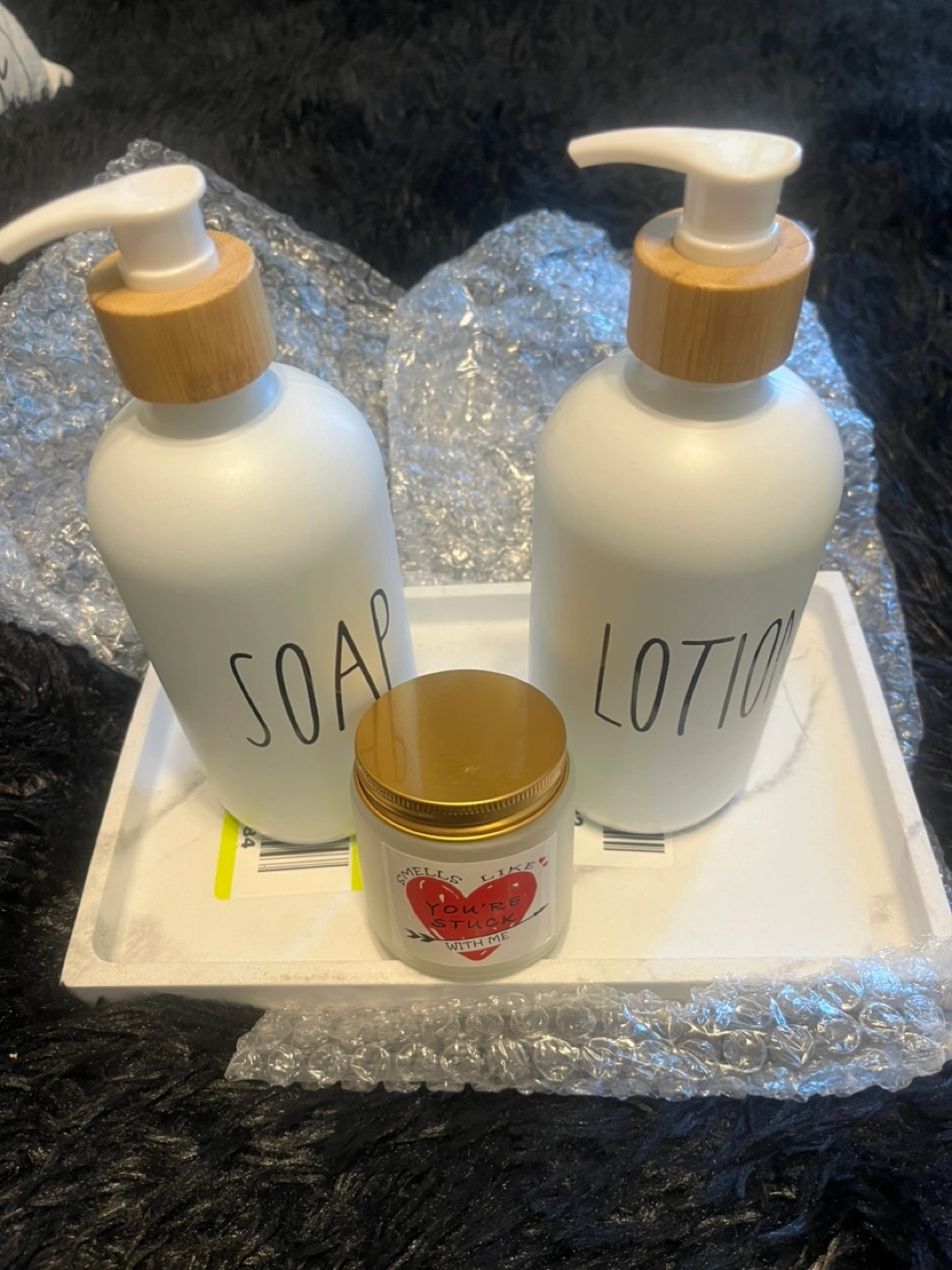 Selling a Rae Dunn set that includes a soap dispenser, a lotion dispenser, and a small jar. The dispensers are white with bamboo-style tops, and the jar has a gold lid. Perfect for adding a touch of style to your bathroom or kitchen!