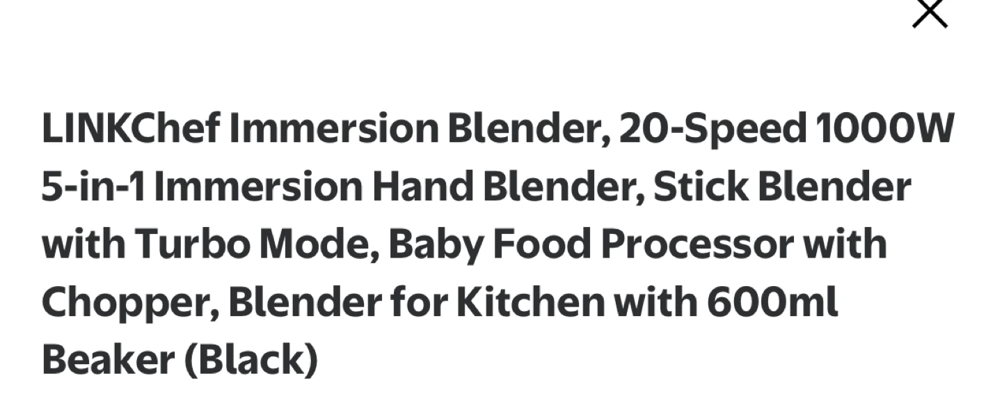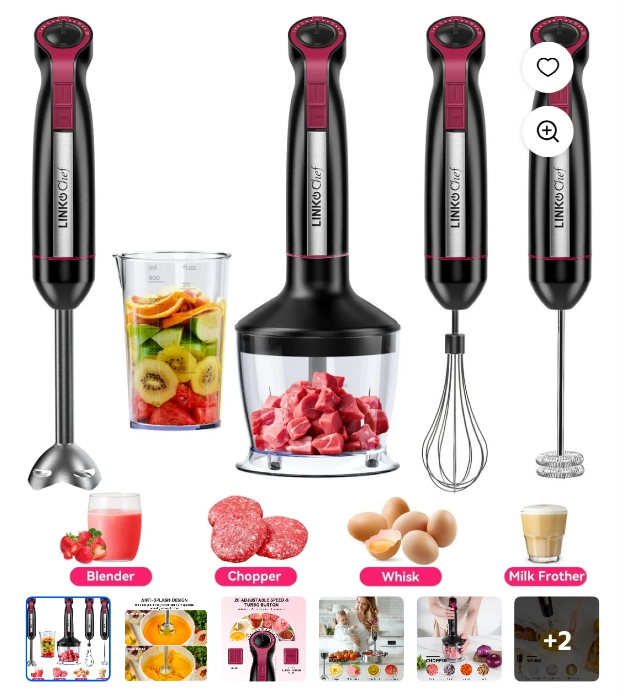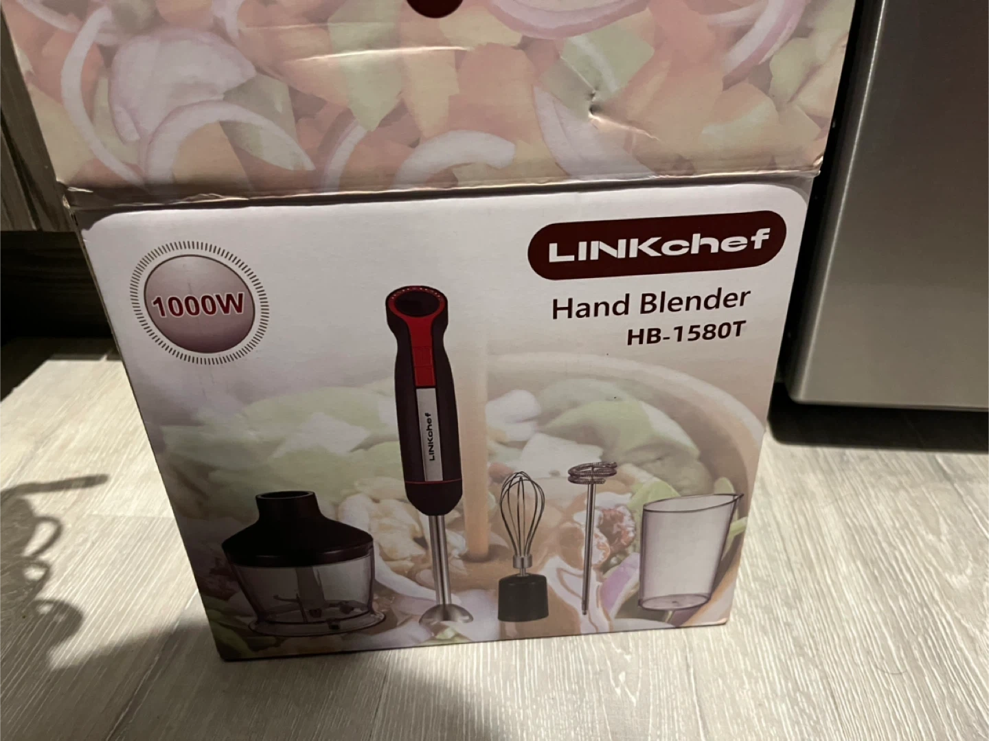Selling a LINKChef Hand Blender (model HB-1580T) in excellent brand new condition! This is a 5-in-1 immersion hand blender with a powerful 1000W motor and 20 adjustable speeds. It features a stick blender with turbo mode, a baby food processor, and includes a chopper and a 600ml beaker. Perfect for all your kitchen needs! Comes with the box