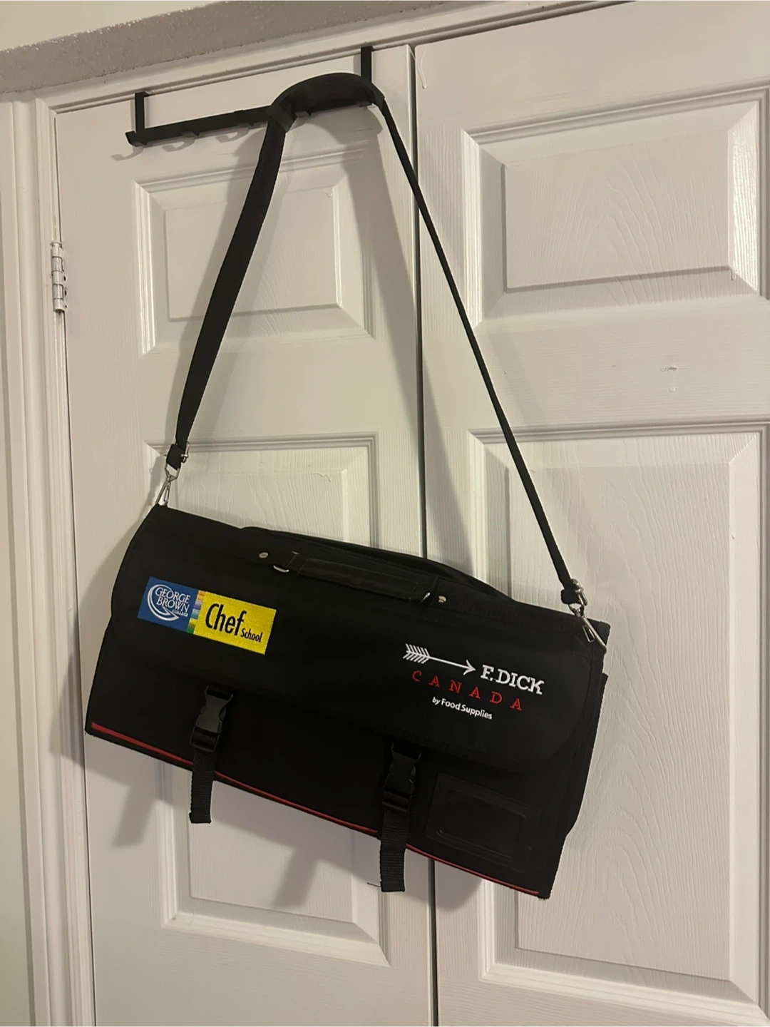 Here's a F. Dick Canada chef knife roll bag. Perfect for George brown college culinary students or professional chefs to carry their knives and tools safely and conveniently. It features multiple compartments and a durable design to keep your knives organized and protected. The bag also has a shoulder strap for easy carrying
