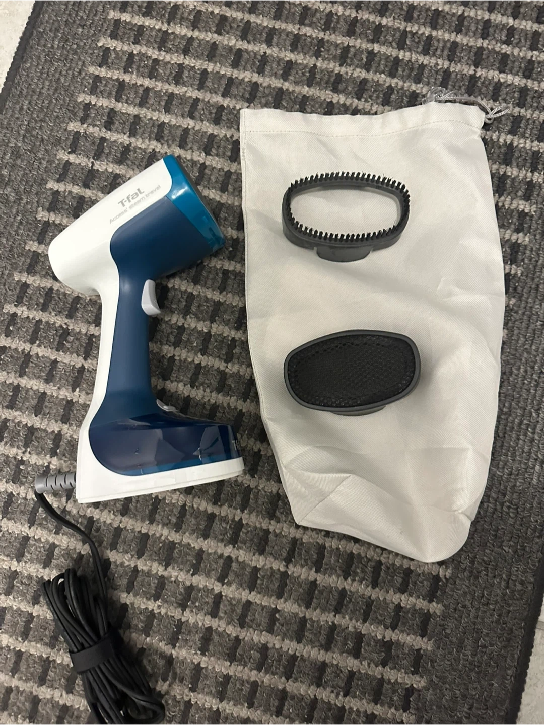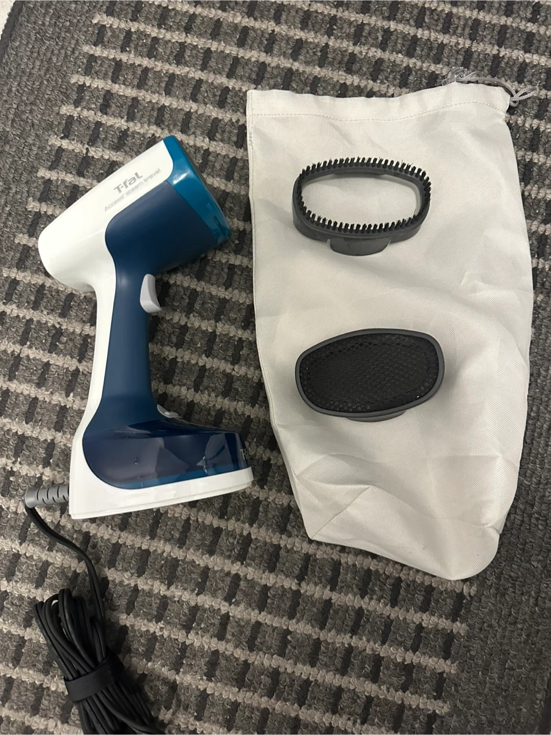 *Like new* - T-fal Access Steam Pocket Steamer, comes with the steamer itself, 2 attachments, and a carrying bag. It's lightweight and portable, perfect for travel or quick touch-ups at home.