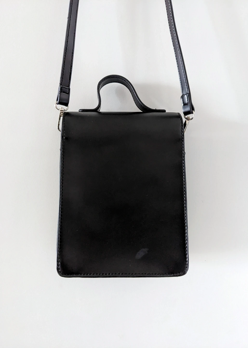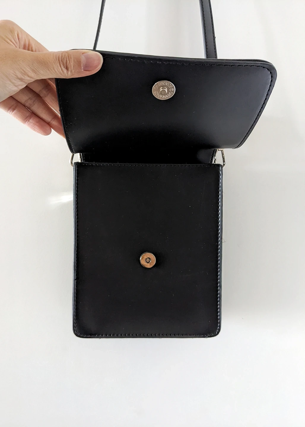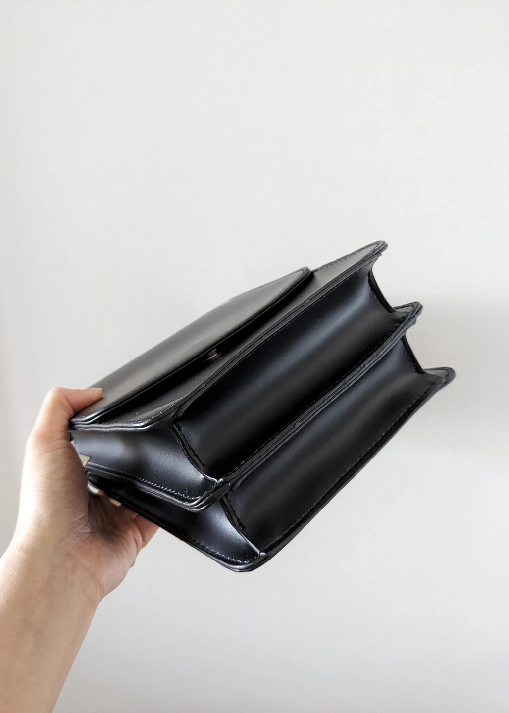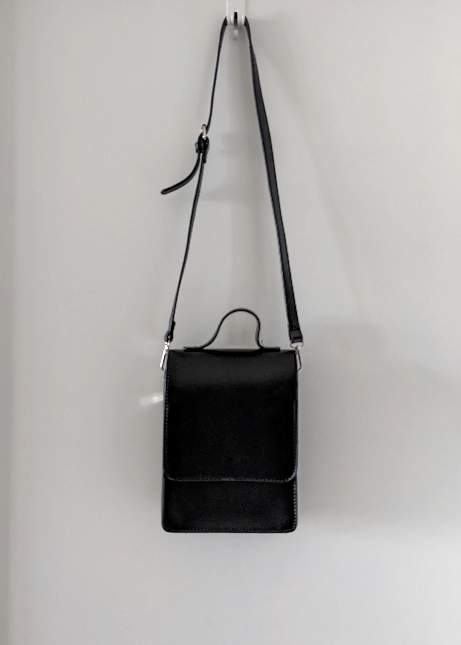 This stylish, faux-leather satchel bag comes from a Japanese brand called Merlot. It has an adjustable strap that functions like a belt, and the front flap uses a magnetic closure. There are two inner compartments, and the entire bag is lined. This is perfect for everyday use, and can comfortably fit a phone, a set of keys, a wallet, an earbuds case, and a small makeup pouch (to name some examples).