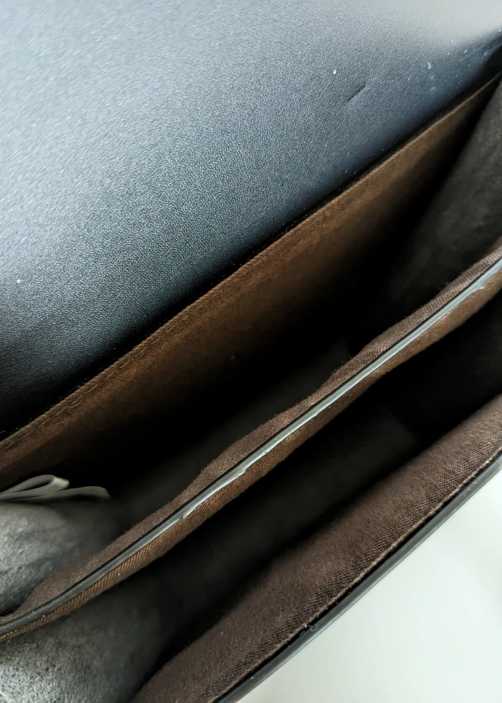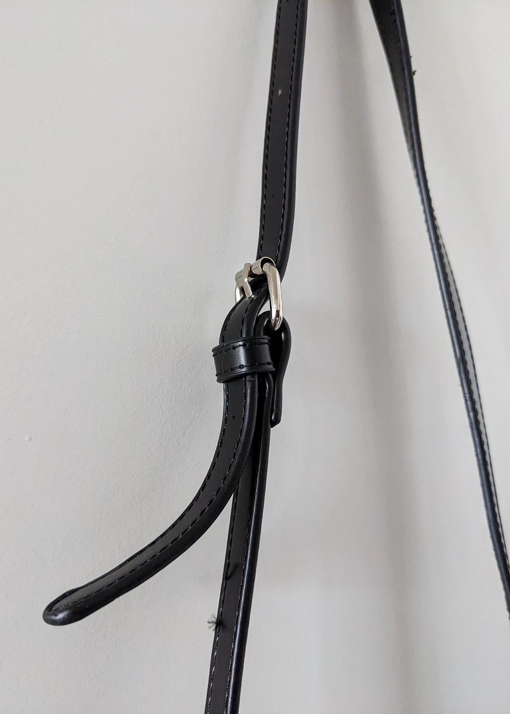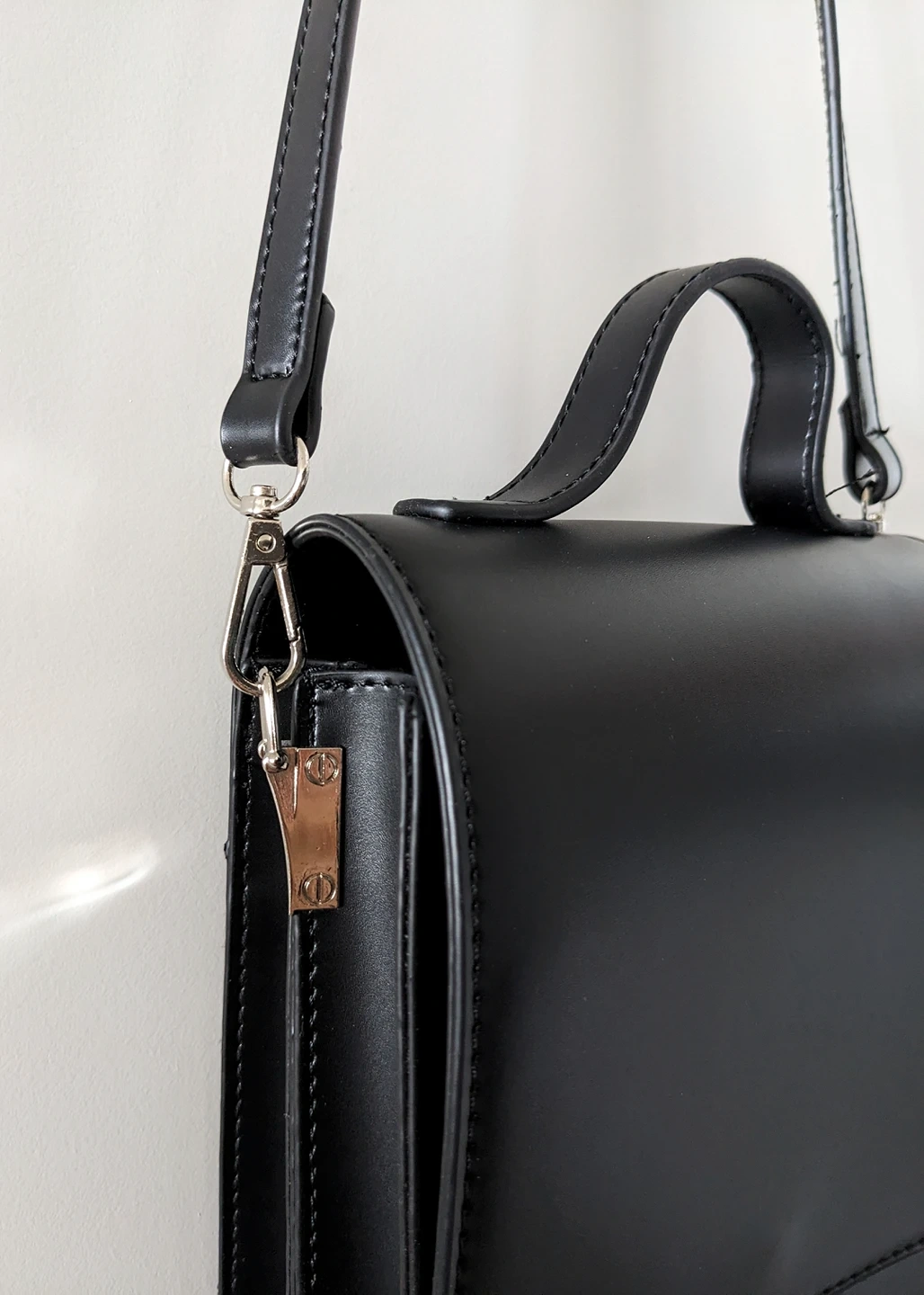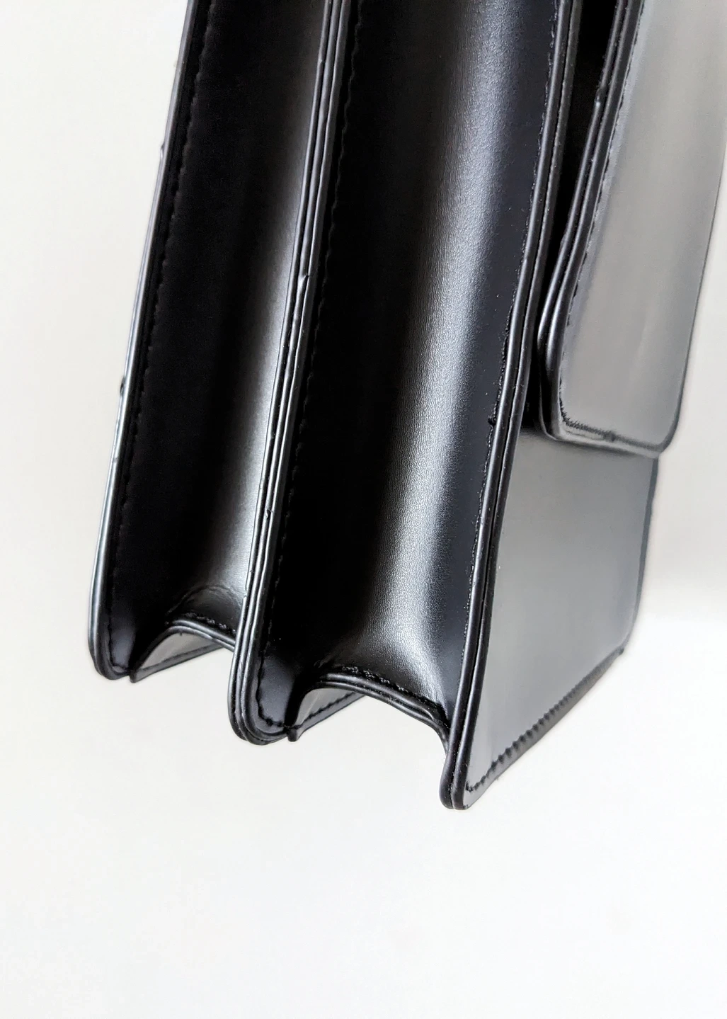 This stylish, faux-leather satchel bag comes from a Japanese brand called Merlot. It has an adjustable strap that functions like a belt, and the front flap uses a magnetic closure. There are two inner compartments, and the entire bag is lined. This is perfect for everyday use, and can comfortably fit a phone, a set of keys, a wallet, an earbuds case, and a small makeup pouch (to name some examples).