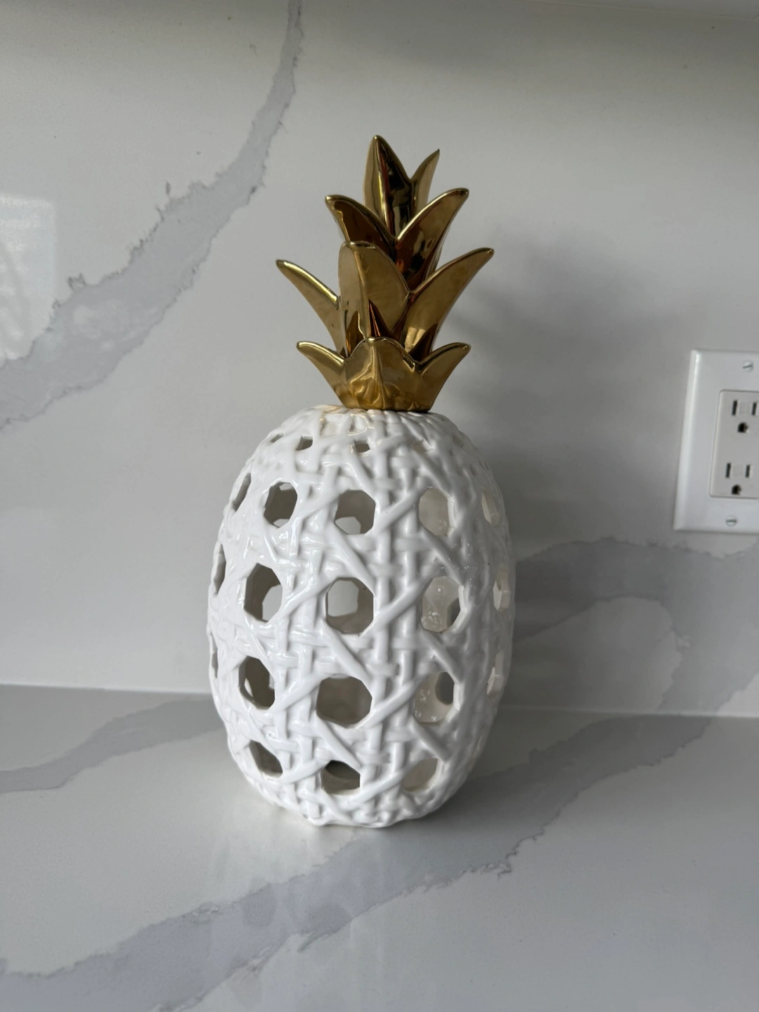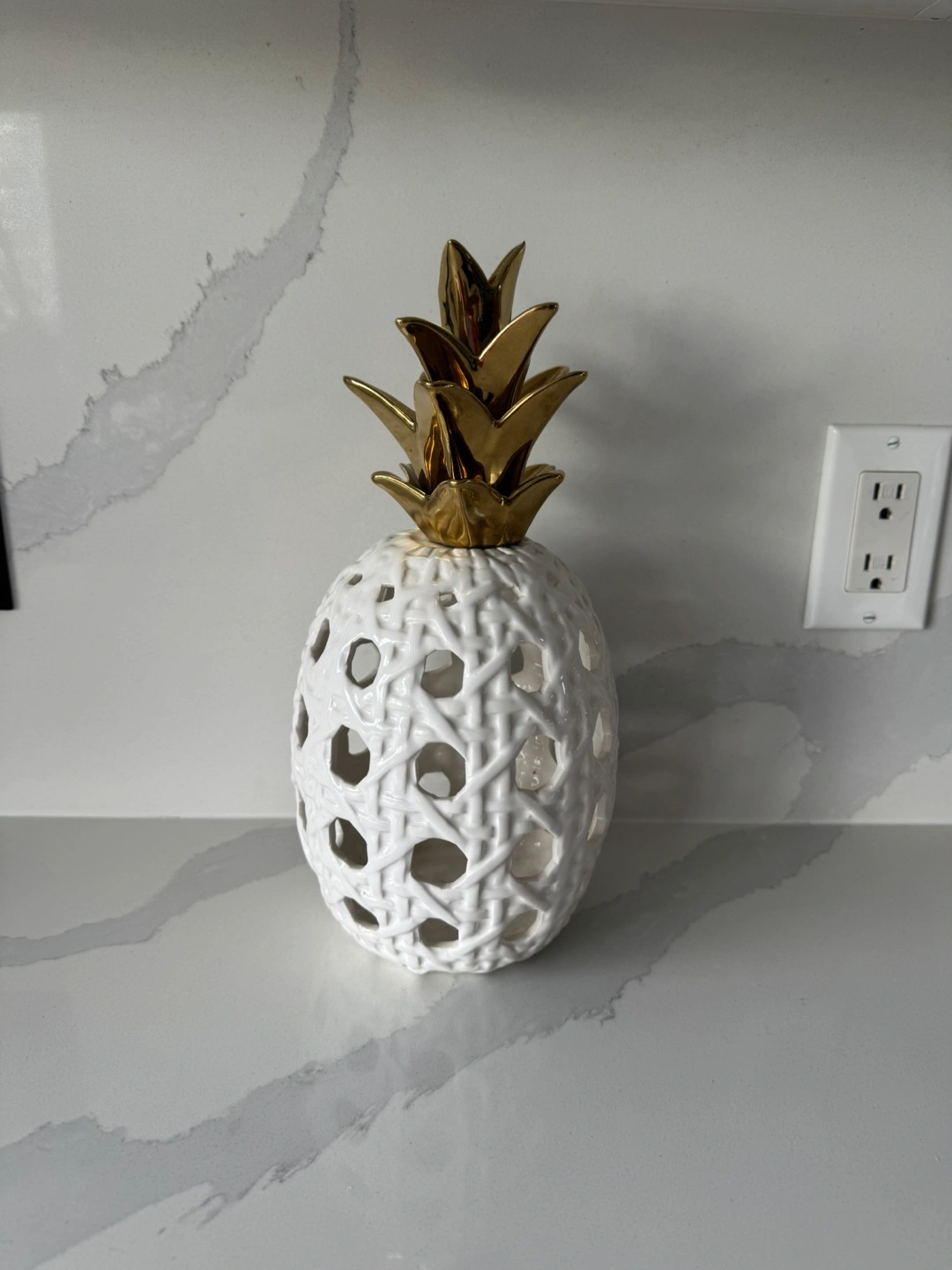 Selling a lovely decorative pineapple! It's white with a gold top and in great condition. A perfect addition to any dining room, kitchen etc etc. Pick uo at Steeles & Bathurst Area