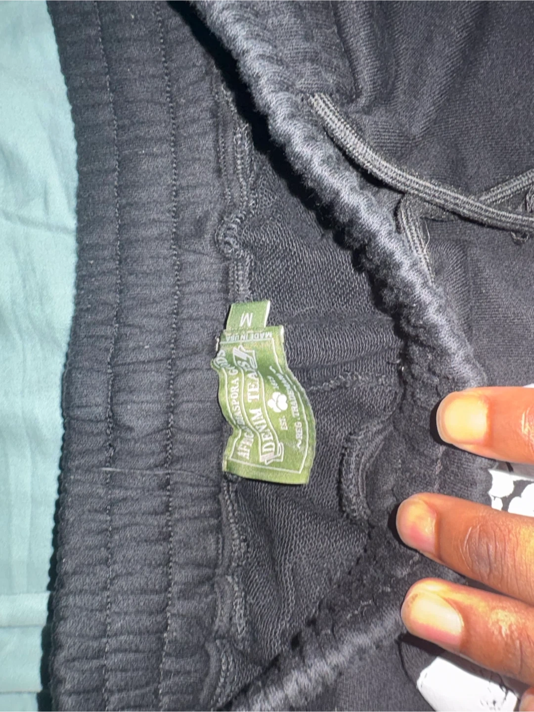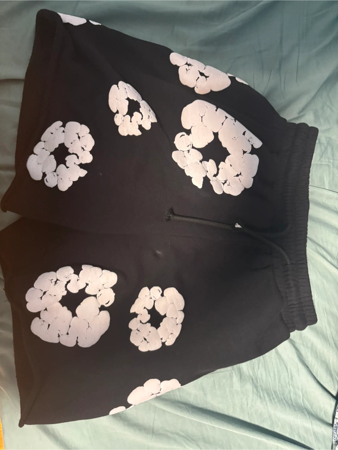 Sportswear Denim Tears black shorts with white floral pattern, size medium. Great for casual wear!