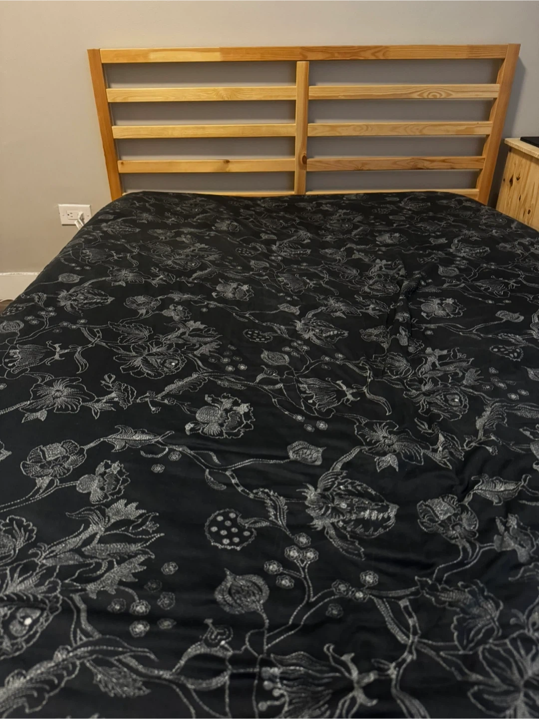 Selling a double-size IKEA TARVA bed frame! This solid wood frame has a classic, natural look that fits any bedroom style. It's sturdy and in great shape, ready for a new home. Mattress included if needed.