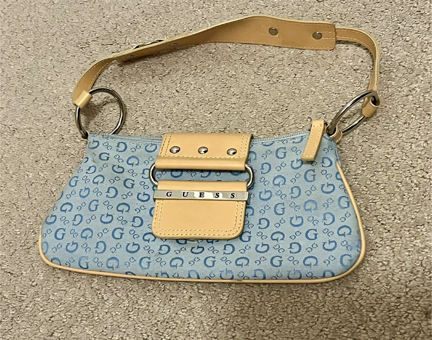 Super cute Guess Y2K era shoulder bag! It has a light blue monogram print and a tan strap. Perfect for adding a little retro flair to your outfit