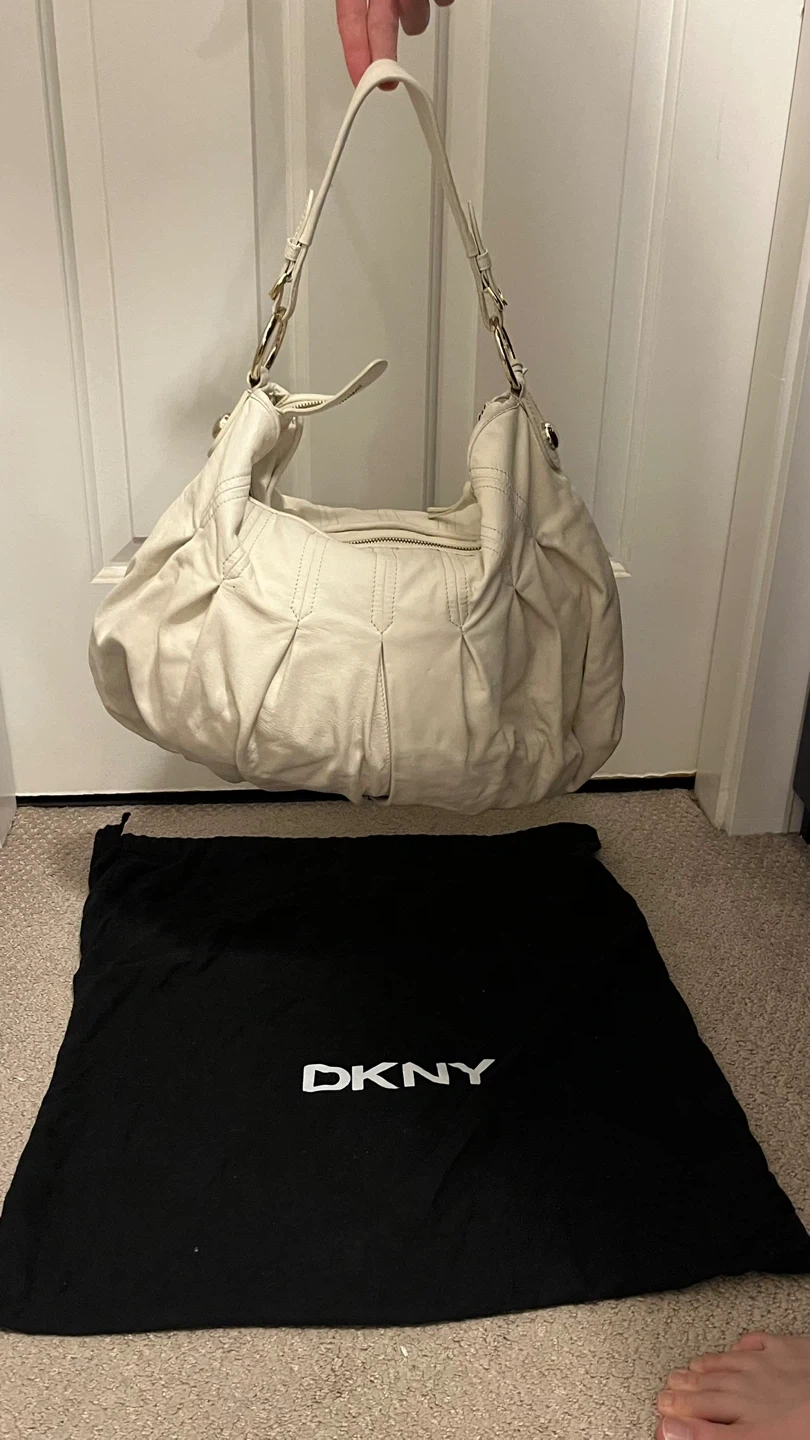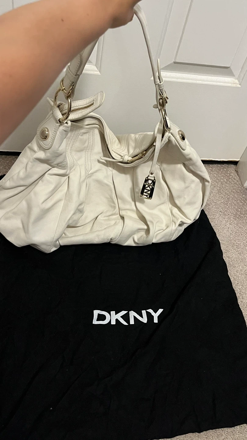 Selling a DKNY whiteleather hobo bag. It's in good condition ( the back has A Jean stain)and comes with its original dust bag. Perfect for everyday use!