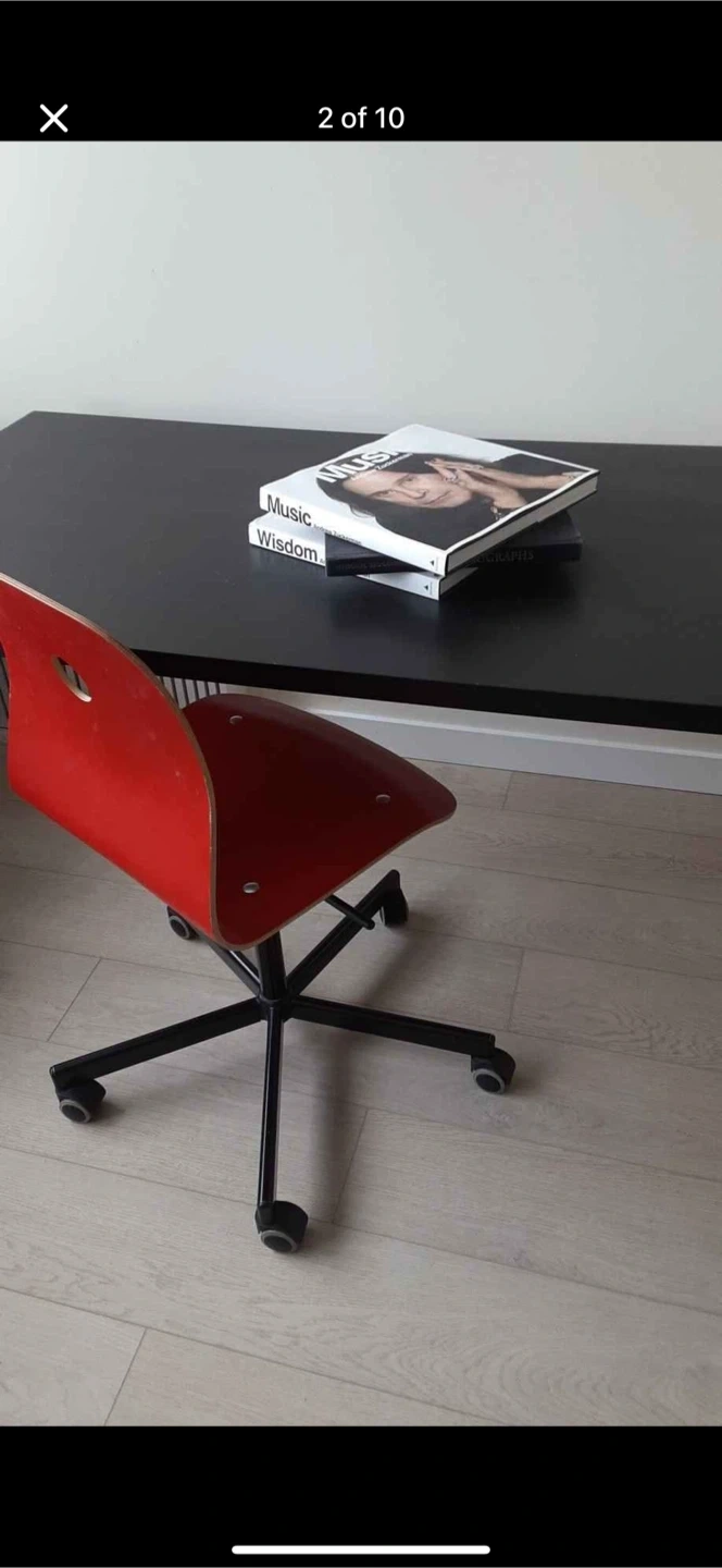 Selling a red office chair. It has a unique design with a hole in the back and a sturdy black base with wheels. Perfect for a home office or study space!