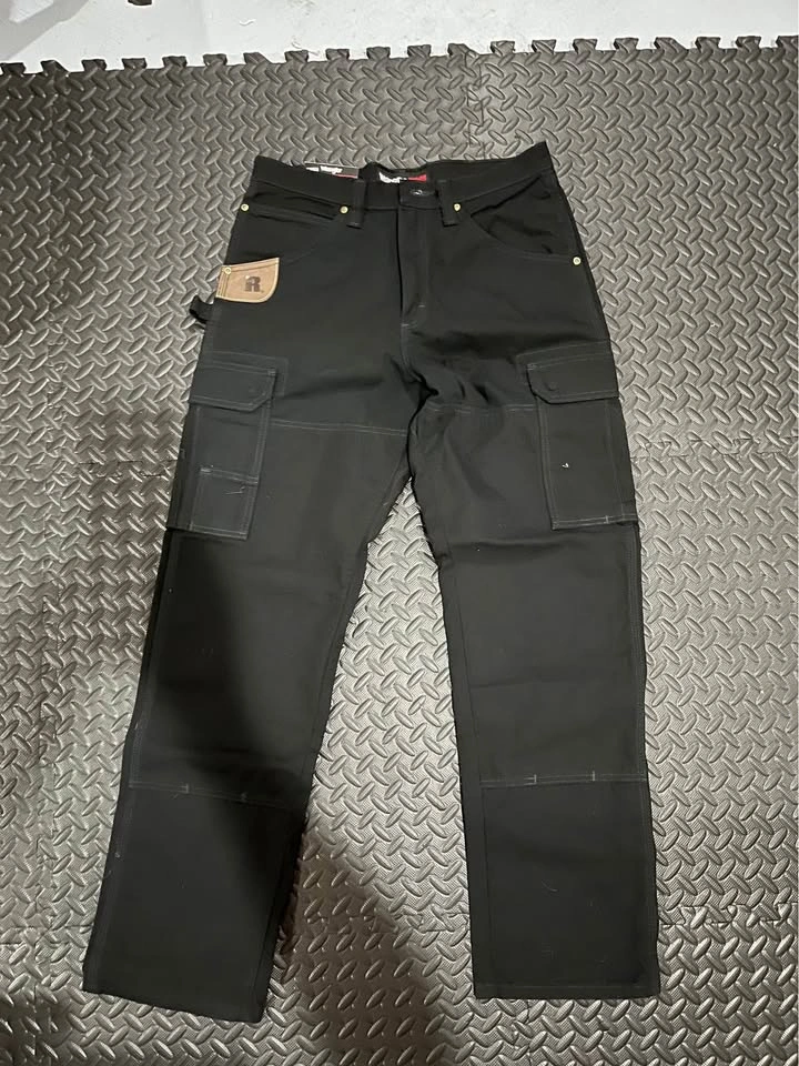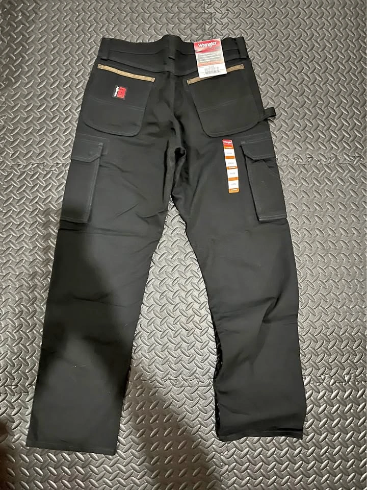 These are brand new Wrangler RIGGS Workwear pants in size 33x32, offering ROOM2MOVE comfort and a tough, durable construction, complete with patented tape measure reinforcement and side cargo pockets.