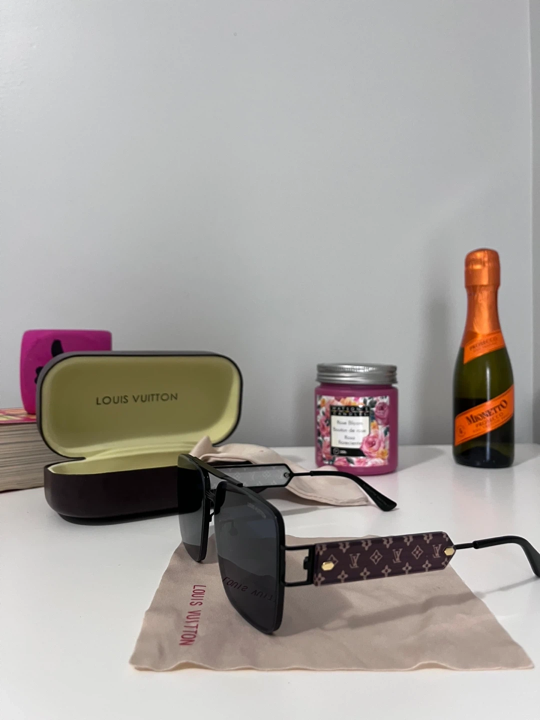Selling a pair of Louis Vuitton sunglasses. They come with the case and a cloth. and have a stylish design with the Louis Vuitton logo on the sides. Perfect for adding a touch of luxury to your look!