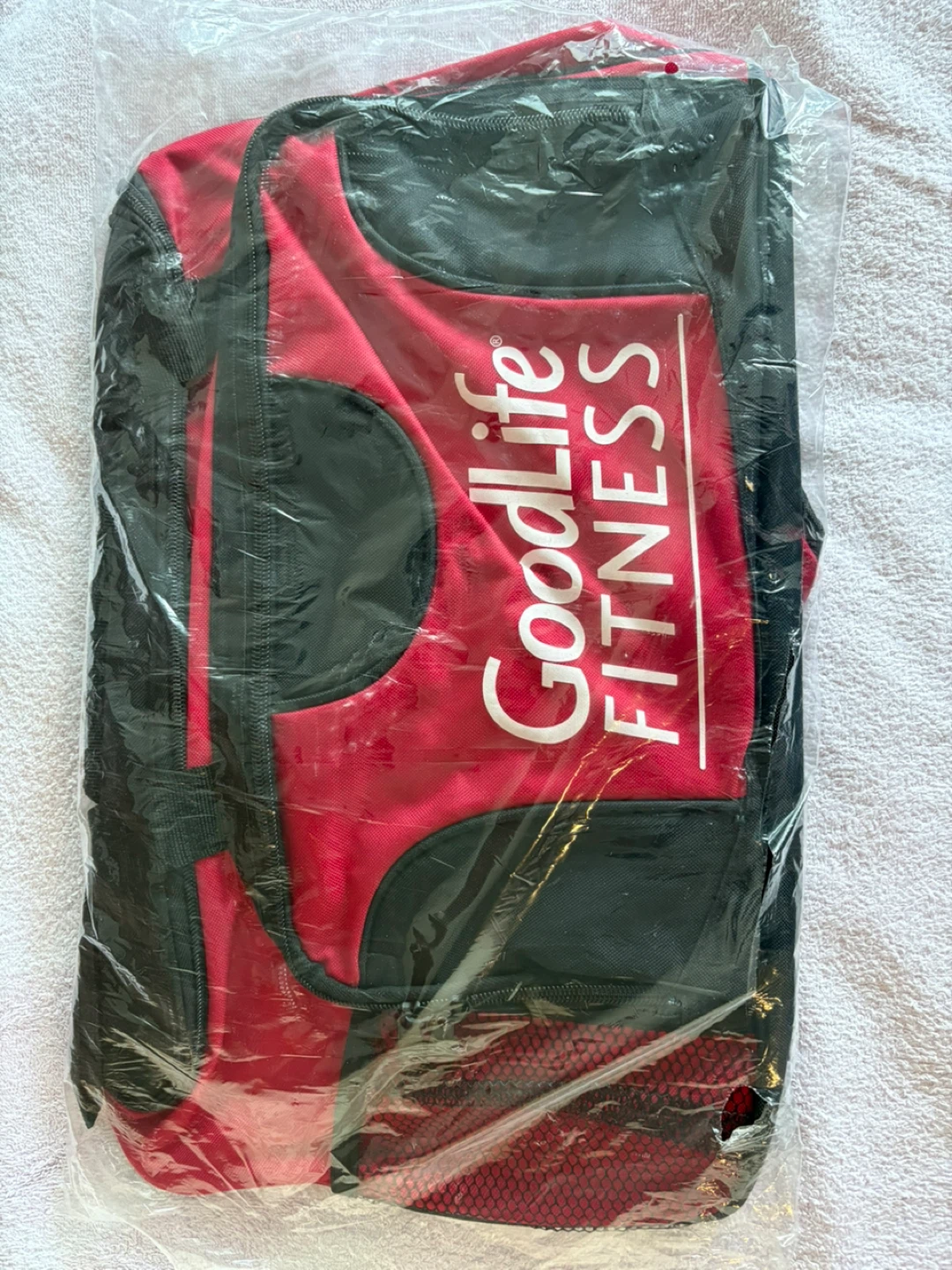 I'm selling a brand new GoodLife Fitness gym bag! It's still in its original packaging. Perfect for carrying your workout essentials to the gym or for any other activities you might have. It's red and black and features the GoodLife Fitness logo. Never been used!